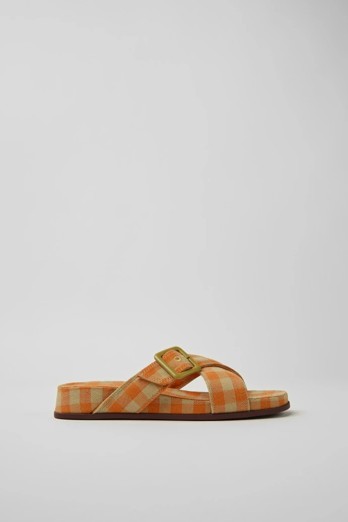 Orange and beige recycled PET and recycled cotton women’s sandals with 100% rubber outsoles.