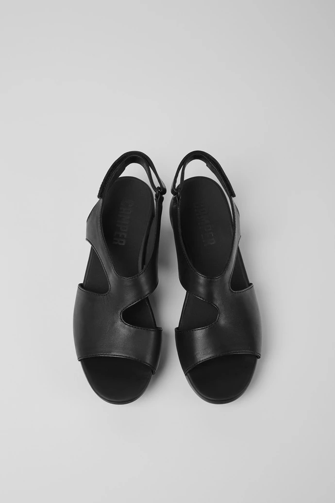 Black sandal for women. Leather upper with straps. Slingback with velcro and open toe. Black wedge outsole, 90% EVA and 10% rubber.