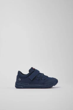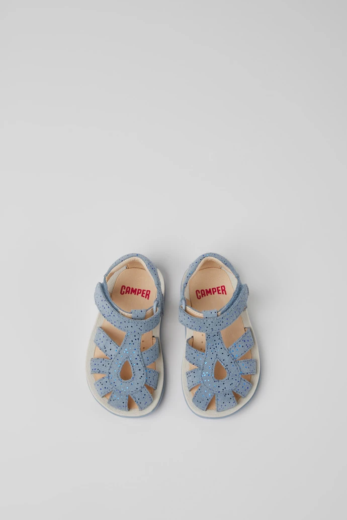 Blue nubuck kids’ sandals with a hook-and-loop closing system and rubber outsoles (20% recycled).