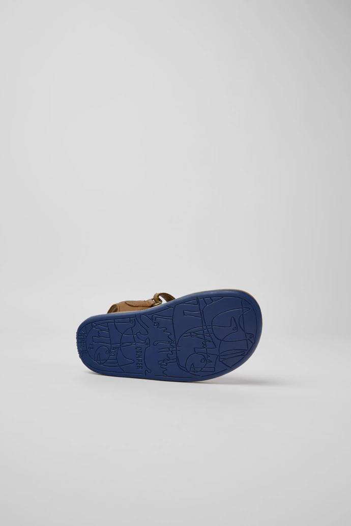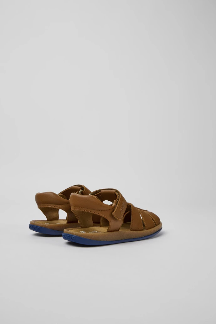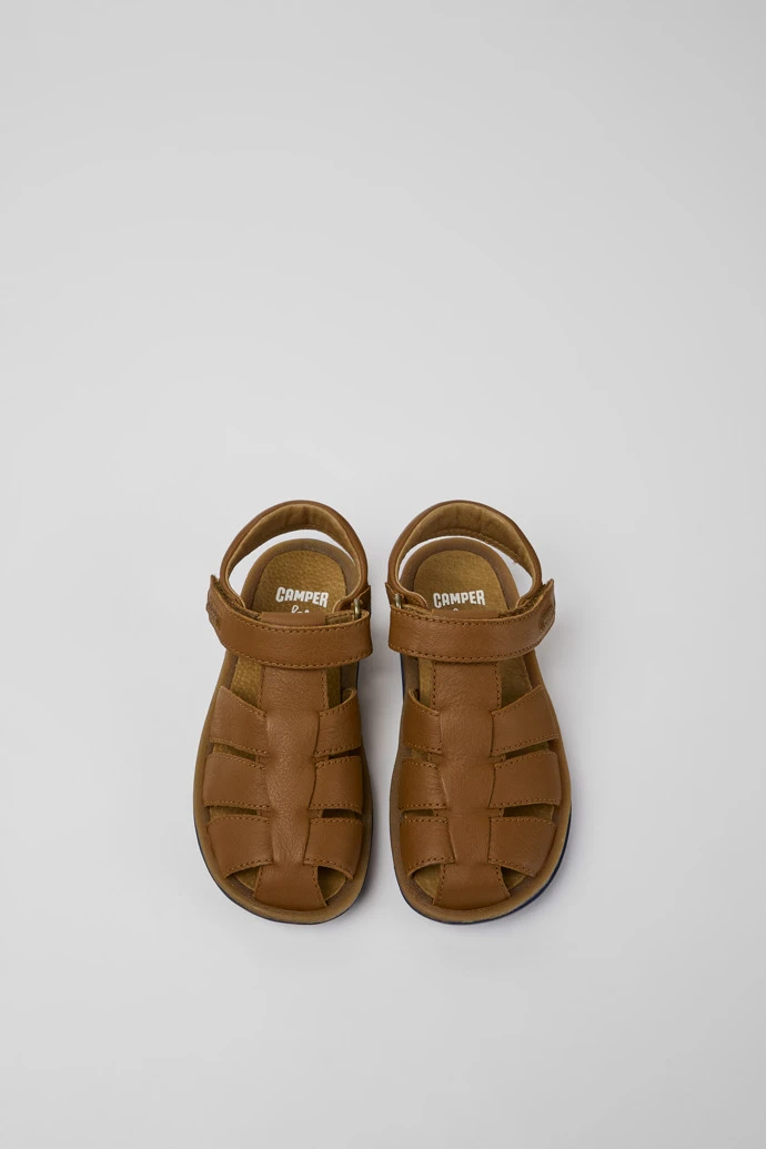 Brown leather kids’ sandals with hook-and-loop closing system and 100% rubber outsoles (20% recycled).