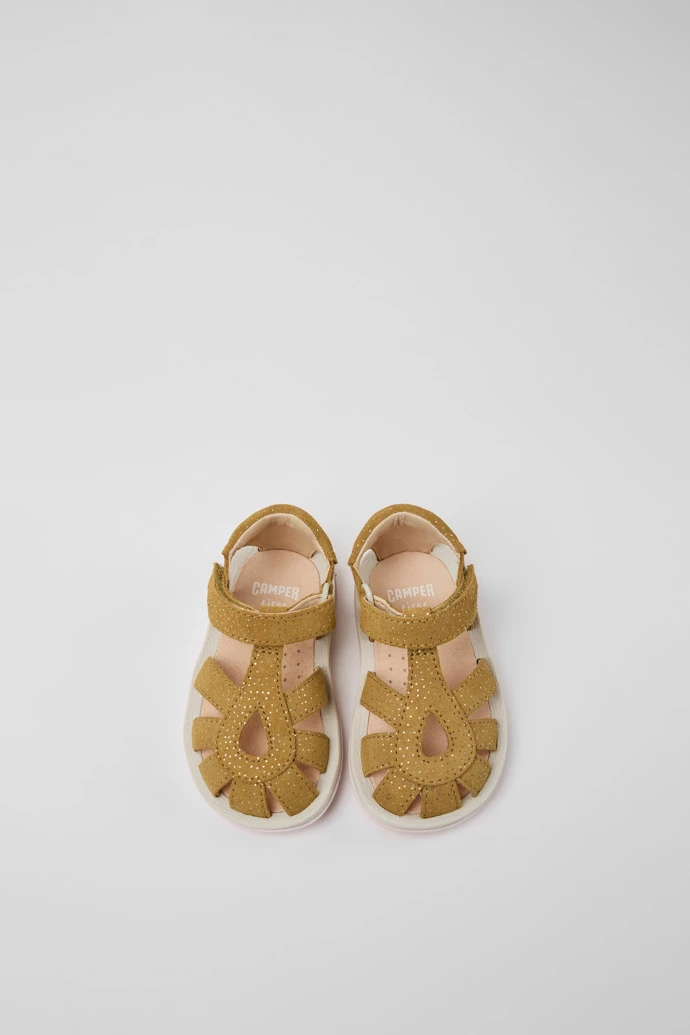 Brown nubuck girls’ sandals with glitter effect, hook-and-loop closing system, and 100% rubber outsoles (20% recycled).