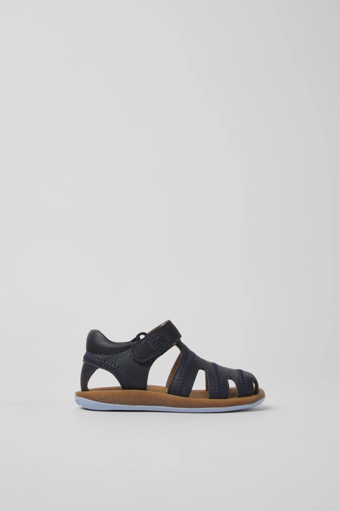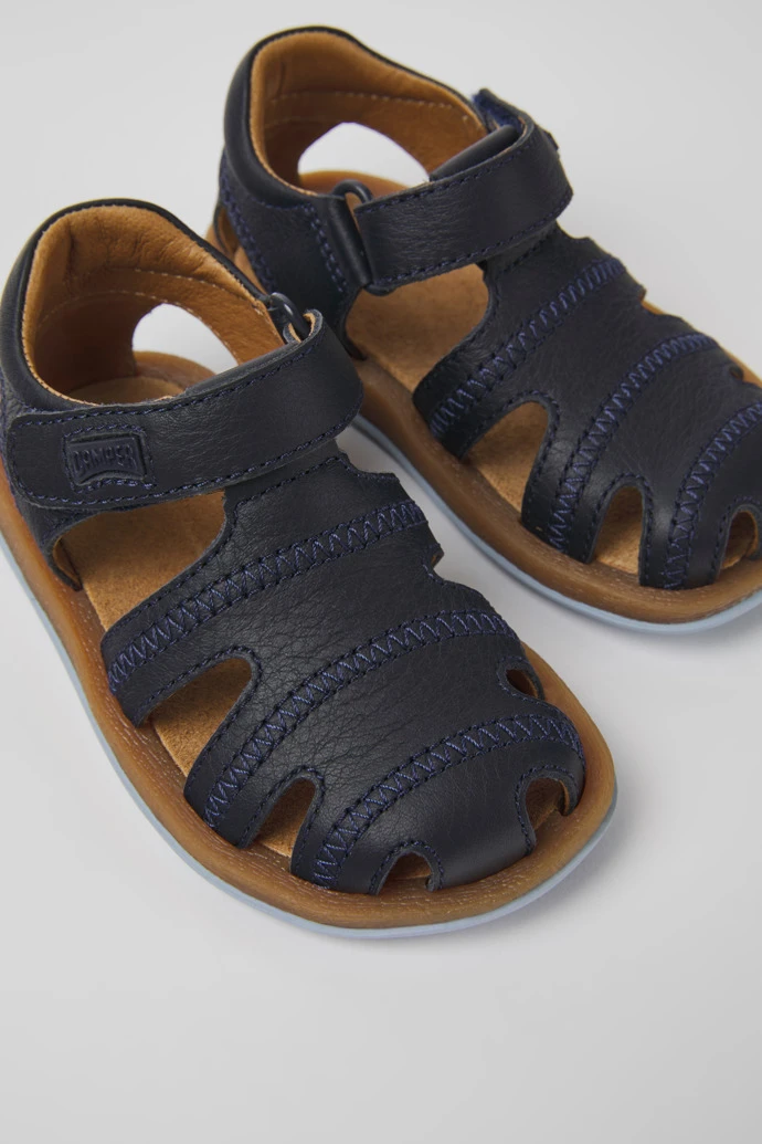 Navy blue leather kids’ sandals with a hook-and-loop closing system and rubber outsoles (20% recycled).