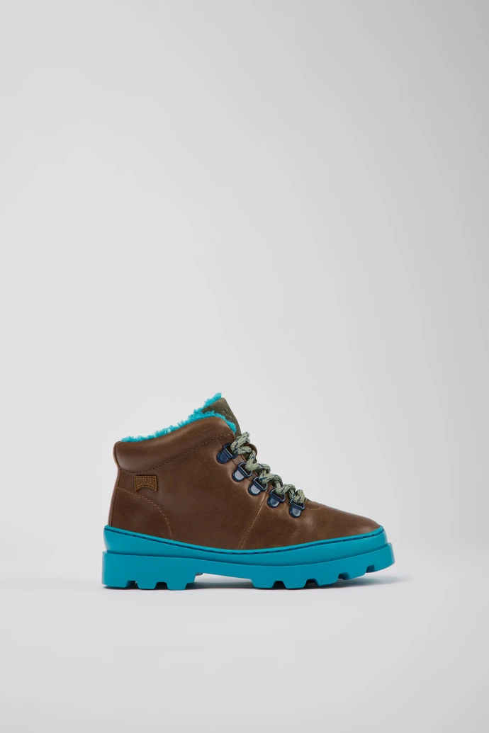 Brown leather and nubuck kids’ ankle boots with faux fur, OrthoLite® Recycledâ„¢ removable footbeds, and rubber outsoles.