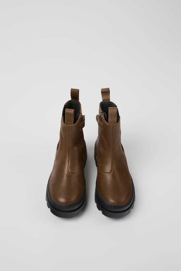 Brown leather kids’ Chelsea boots with OrthoLite® Recycled™ removable footbeds and rubber outsoles.