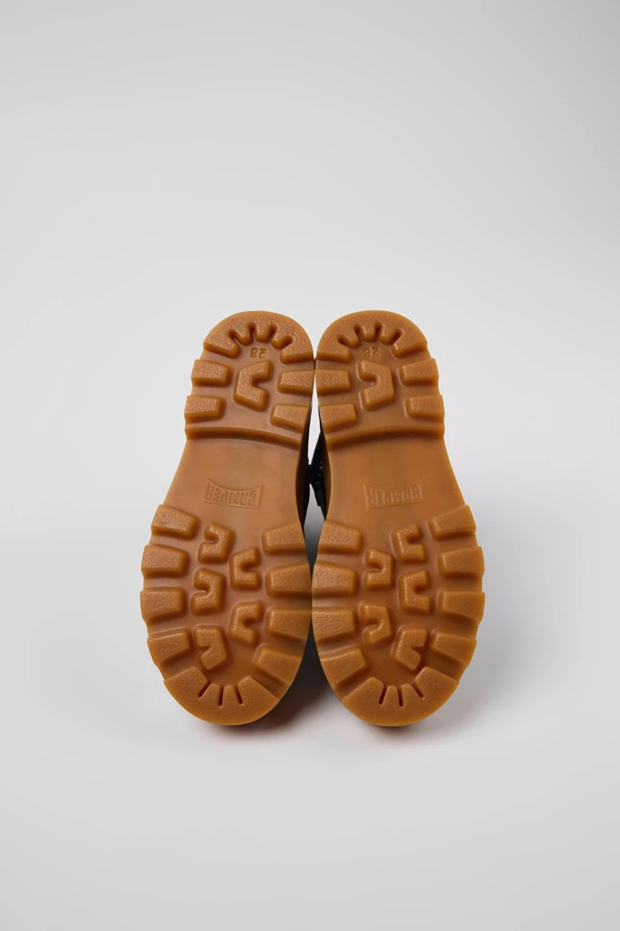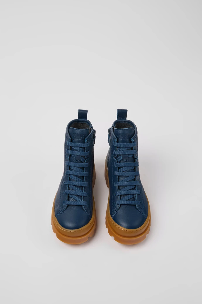 Dark blue leather kids’ ankle boots with OrthoLite® Recycled™ removable footbeds and rubber outsoles.