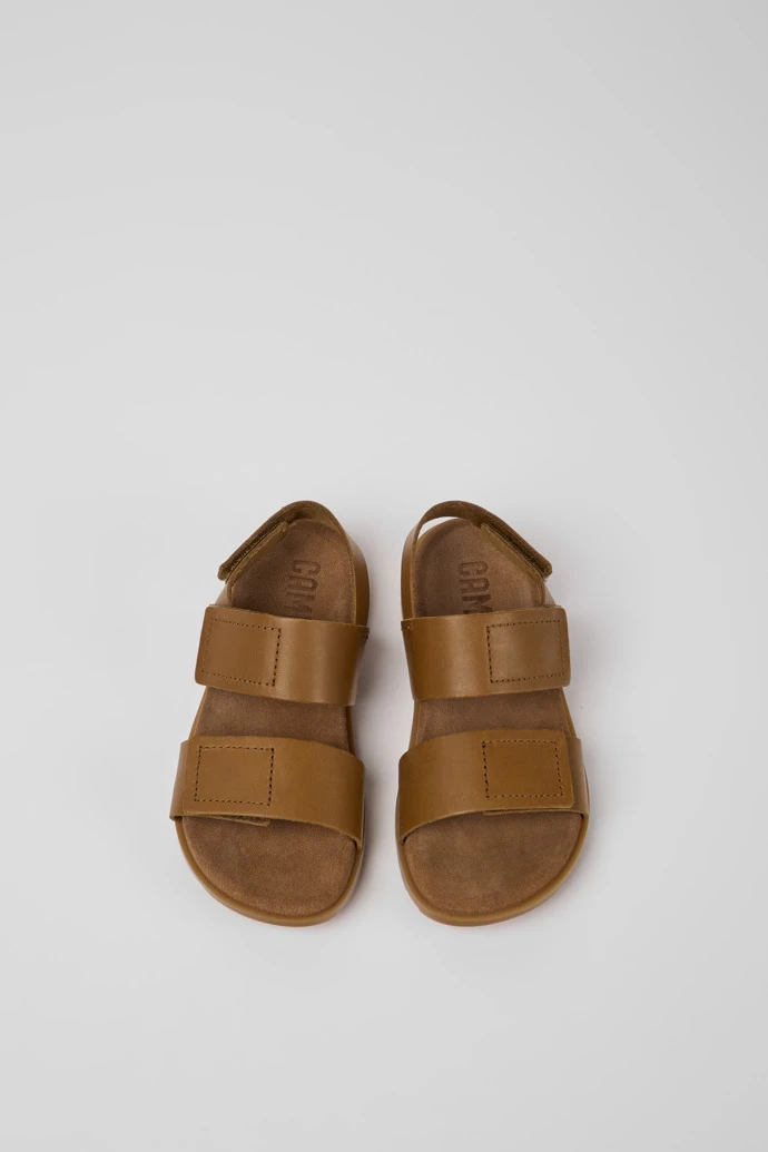 Brown leather kids’ sandals with hook-and-loop closing system and 100% rubber outsoles.
