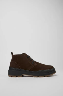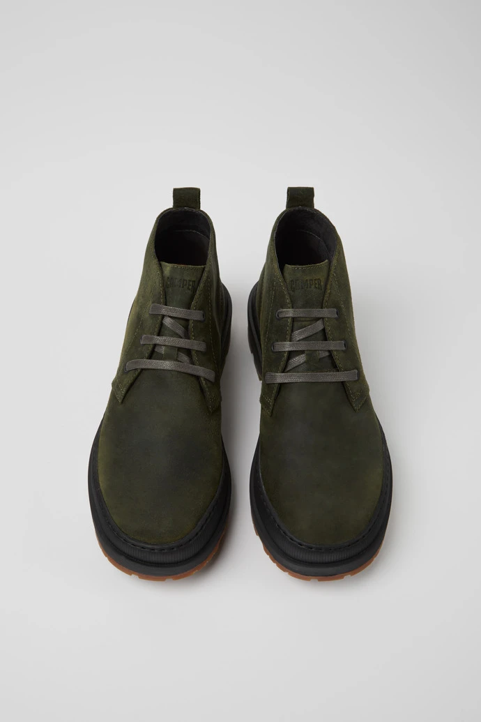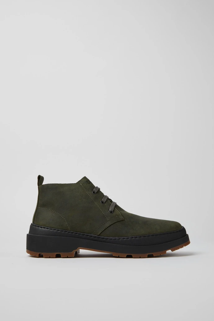 Dark green nubuck men’s ankle boots with EVA midsoles, OrthoLite® Recycled™ footbeds, and Michelin rubber outsoles (27% natural).
