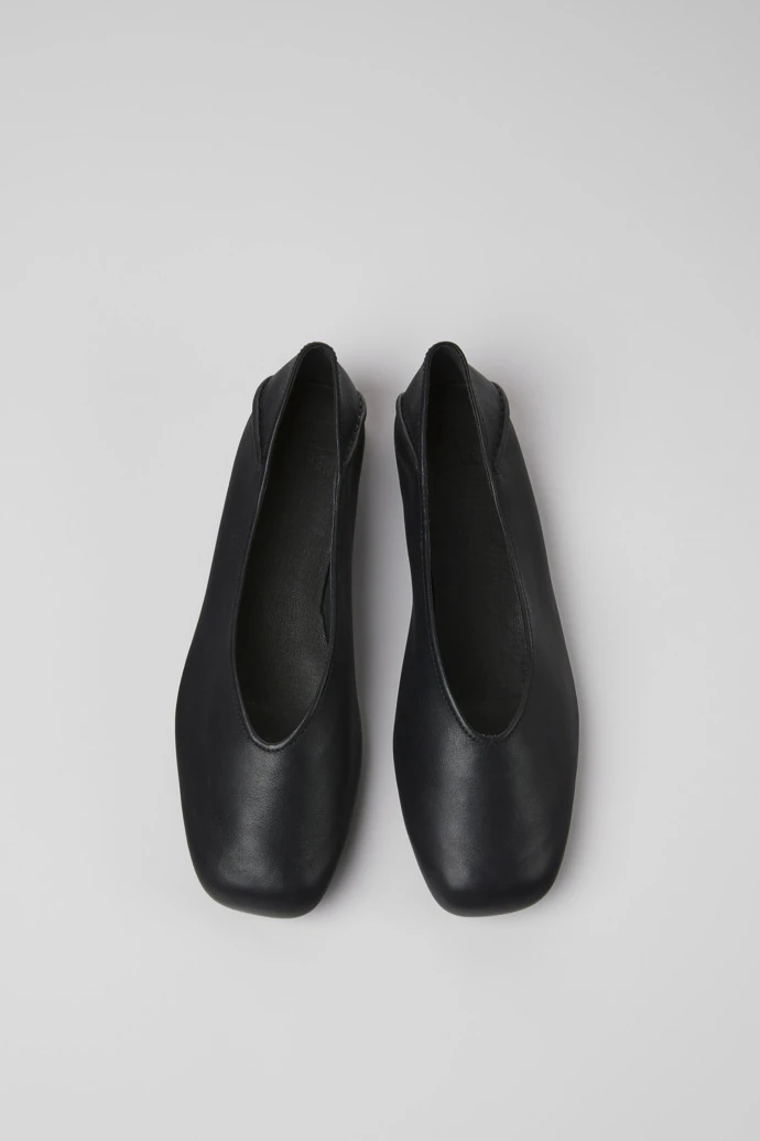 Black leather women’s ballerina flats with OrthoLite® Recycled™ non-removable footbeds and TPU outsoles (20% recycled).
