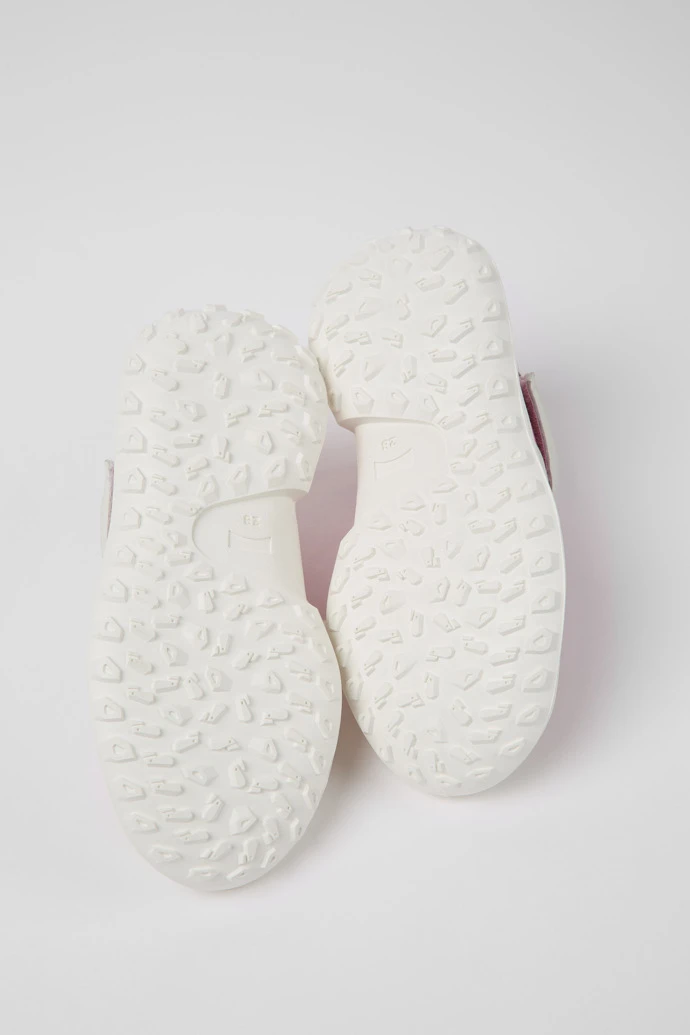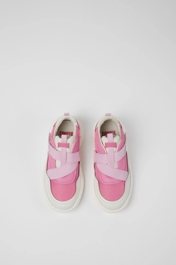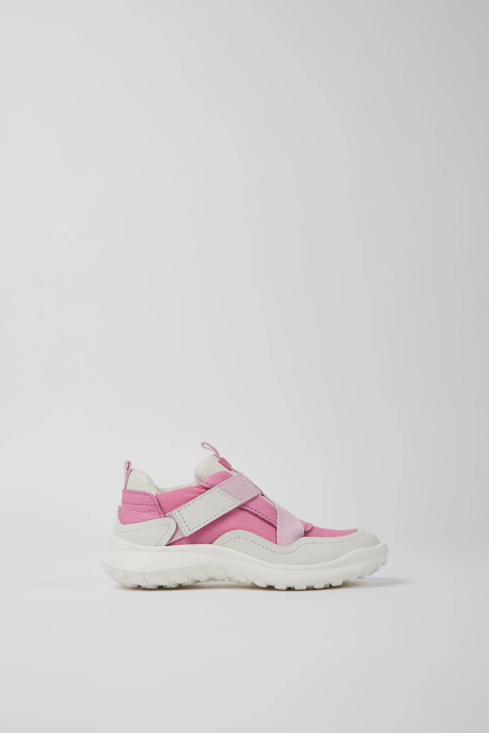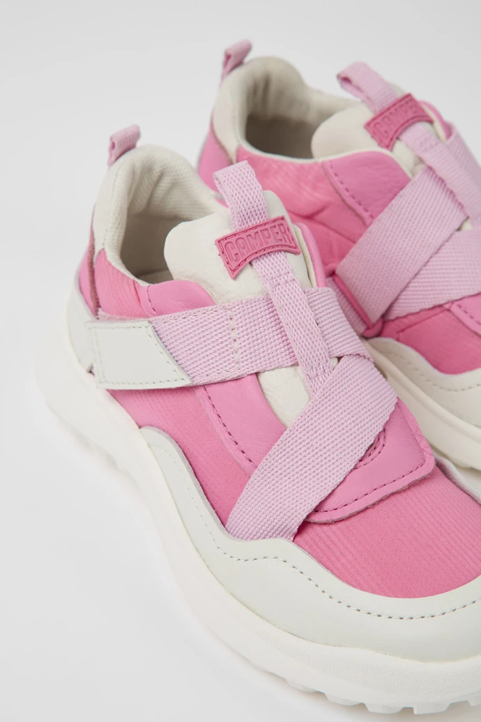 Pink leather and textile kids’ sneakers with OrthoLite® Recycled™ removable footbeds and rubber outsoles.