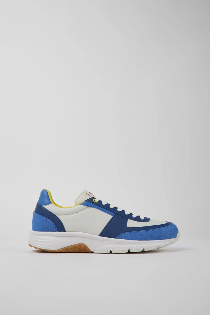 Blue and white recycled polyester and nubuck men’s sneakers with 70% EVA and 30% rubber outsoles.