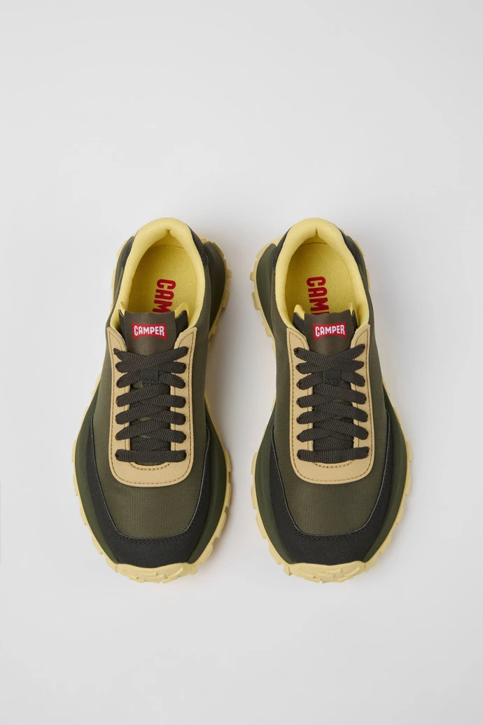 Green textile and nubuck women’s sneakers with OrthoLite® Recycledâ„¢ removable footbeds and Vibram outsoles (30% rubber, 70% EVA).
