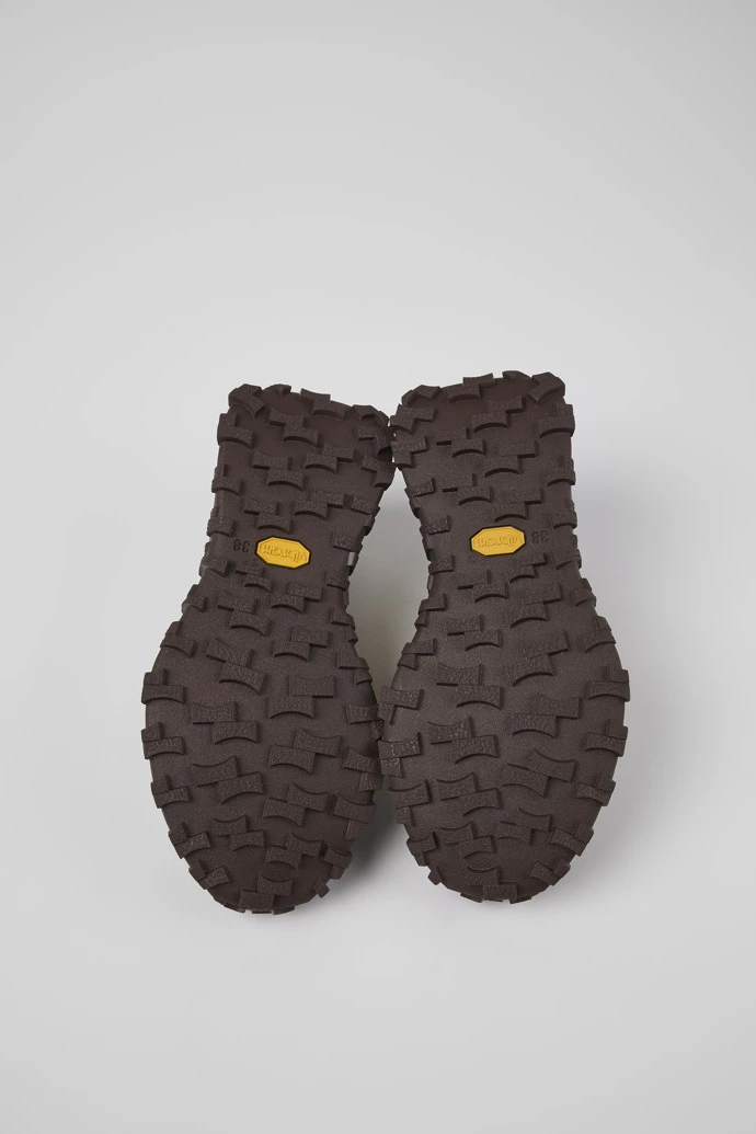 Beige recycled PET and nubuck women’s sneakers with OrthoLite® Recycled™ removable footbeds and Vibram outsoles (30% rubber, 70% EVA).