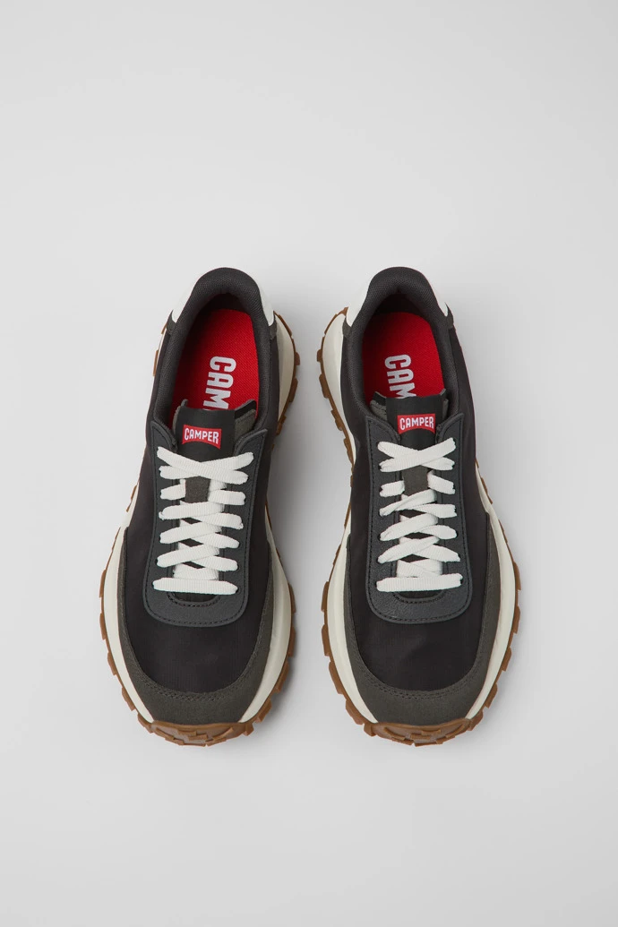 Black recycled PET and nubuck men’s sneakers with OrthoLite® Recycled™ removable footbeds and Vibram outsoles (30% rubber, 70% EVA).