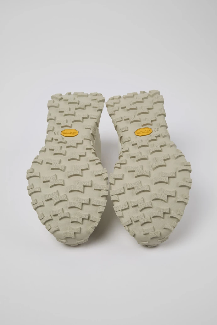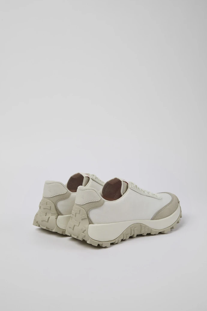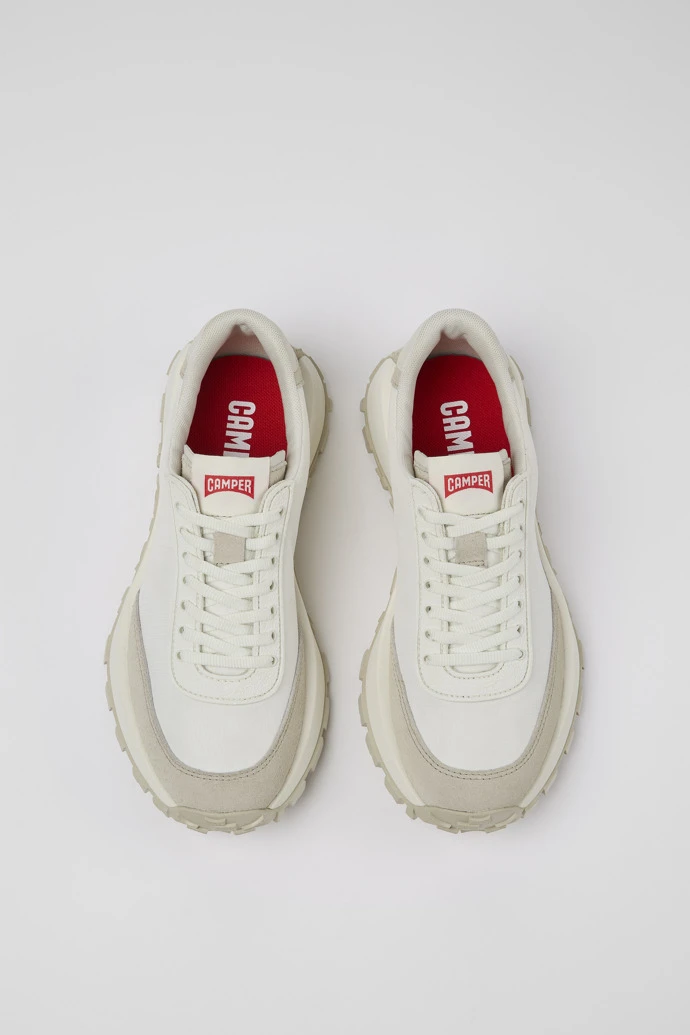 White textile and nubuck women’s sneakers with OrthoLite® Recycledâ„¢ removable footbeds and Vibram outsoles (30% rubber, 70% EVA).