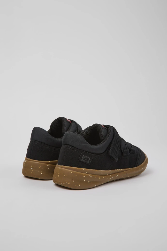 Black textile kids’ shoes with recycled PrimaLoft® technology and rubber outsoles (20% recycled).