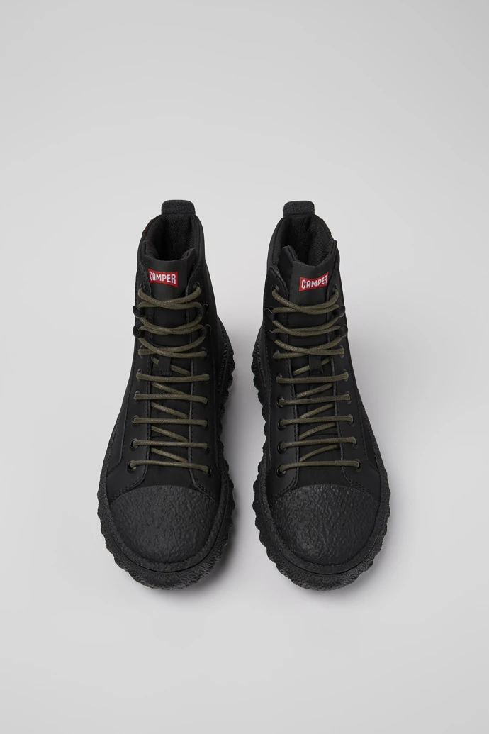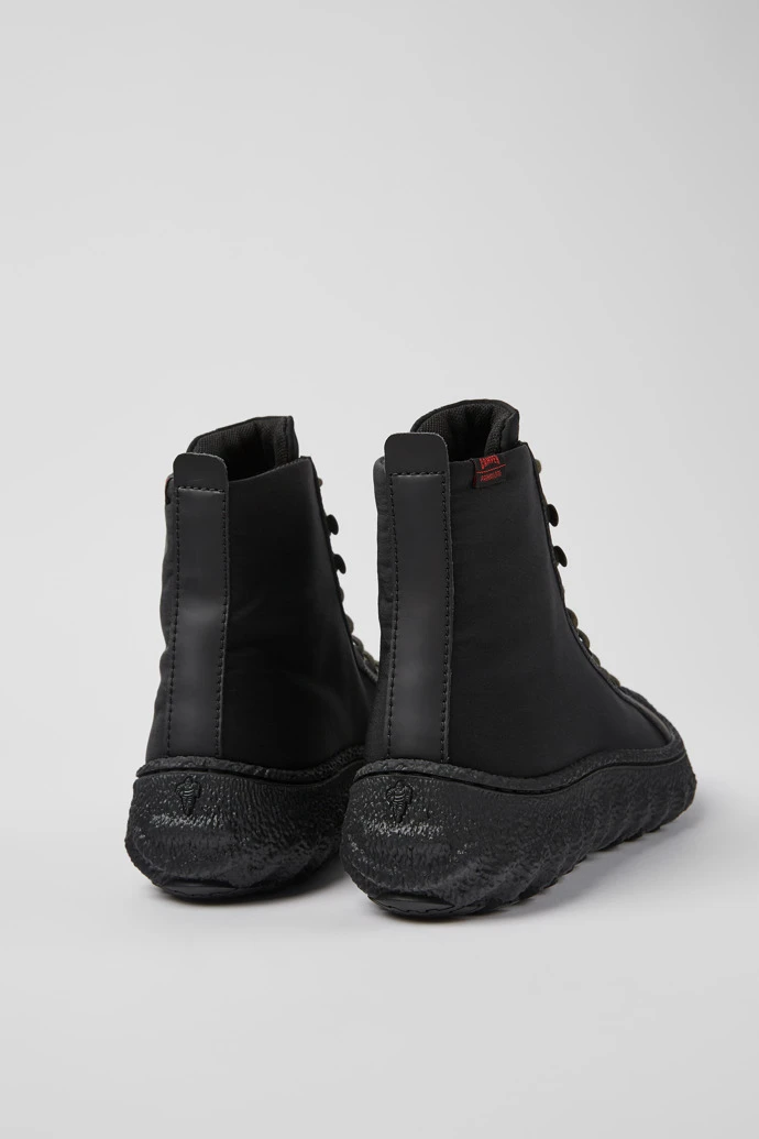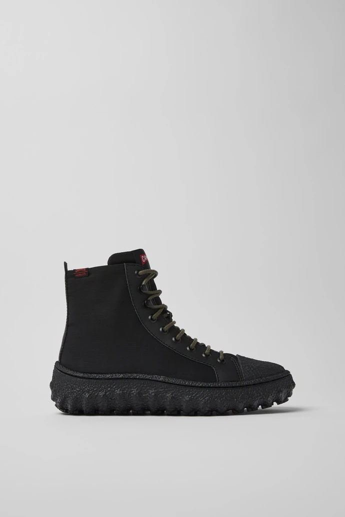Black women’s ankle boots with recycled nylon and recycled leather uppers with a water repellent treatment, plus recycled Primaloft® membranes, OrthoLite® Recycled™ footbeds, and Michelin rubber outsoles (27% natural).