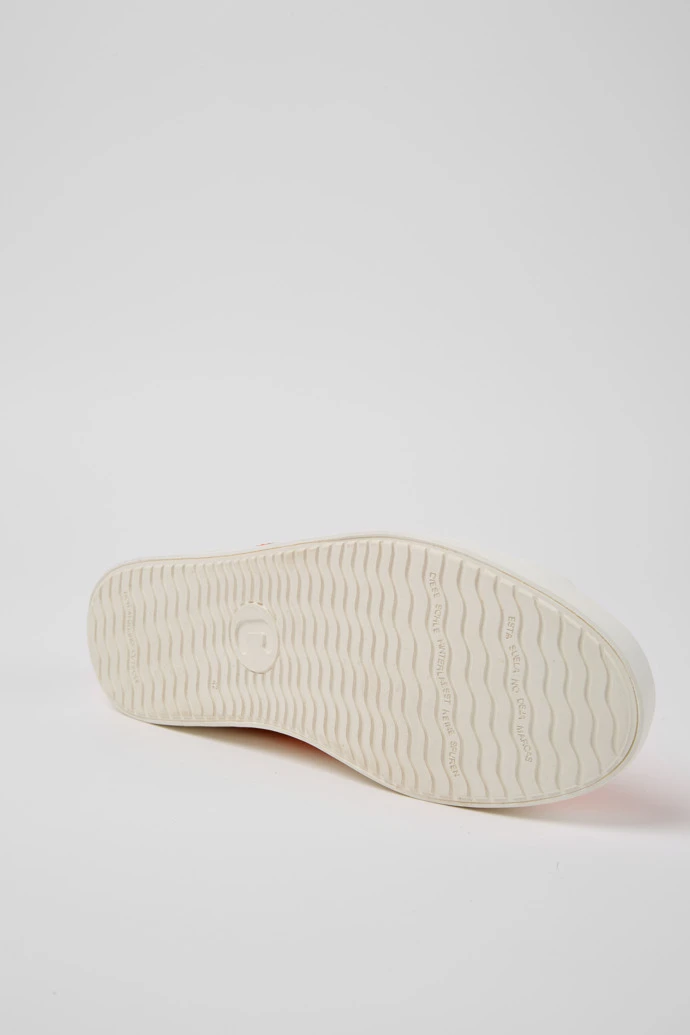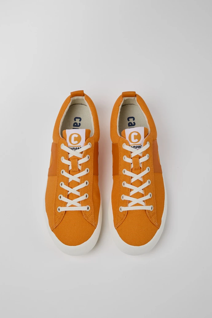 Orange leather and recycled cotton men’s sneakers with 100% rubber outsoles.
