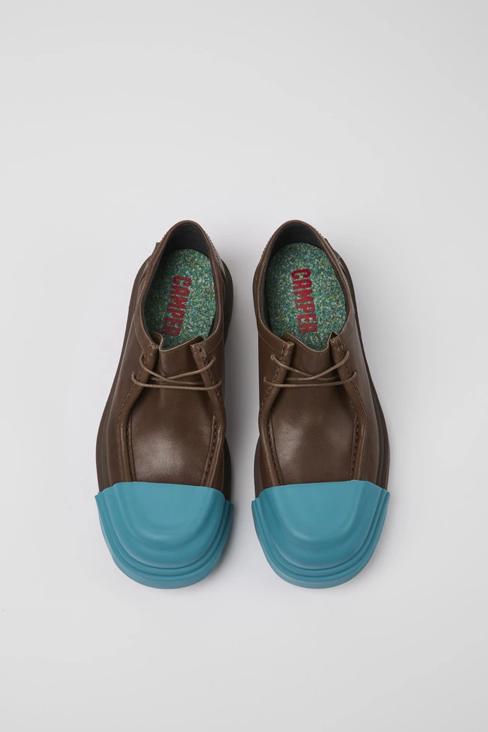 Brown responsibly raised leather women’s shoes with removable toe caps, OrthoLite® Recycled™ removable footbeds, and rubber outsoles (40% natural, 23% recycled).