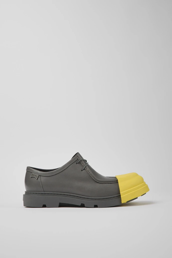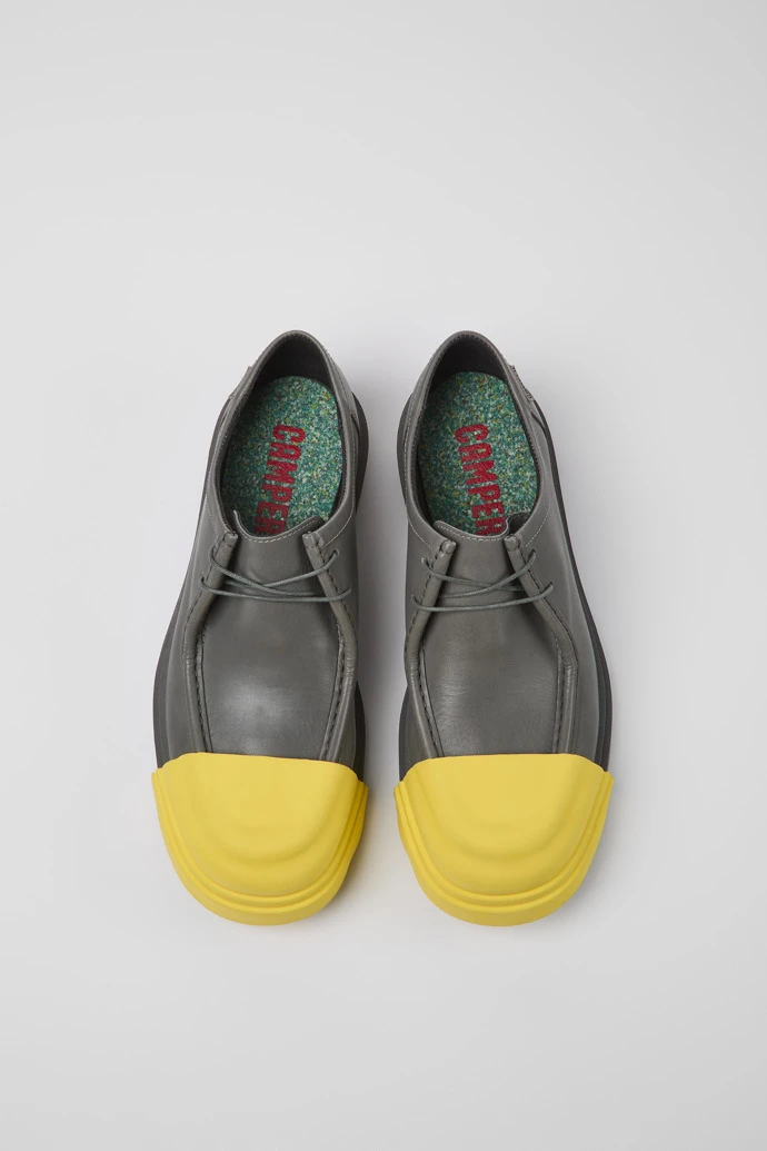 Gray responsibly raised leather men’s shoes with removable toe caps, OrthoLite® Recycled™ removable footbeds, and rubber outsoles (40% natural, 23% recycled).