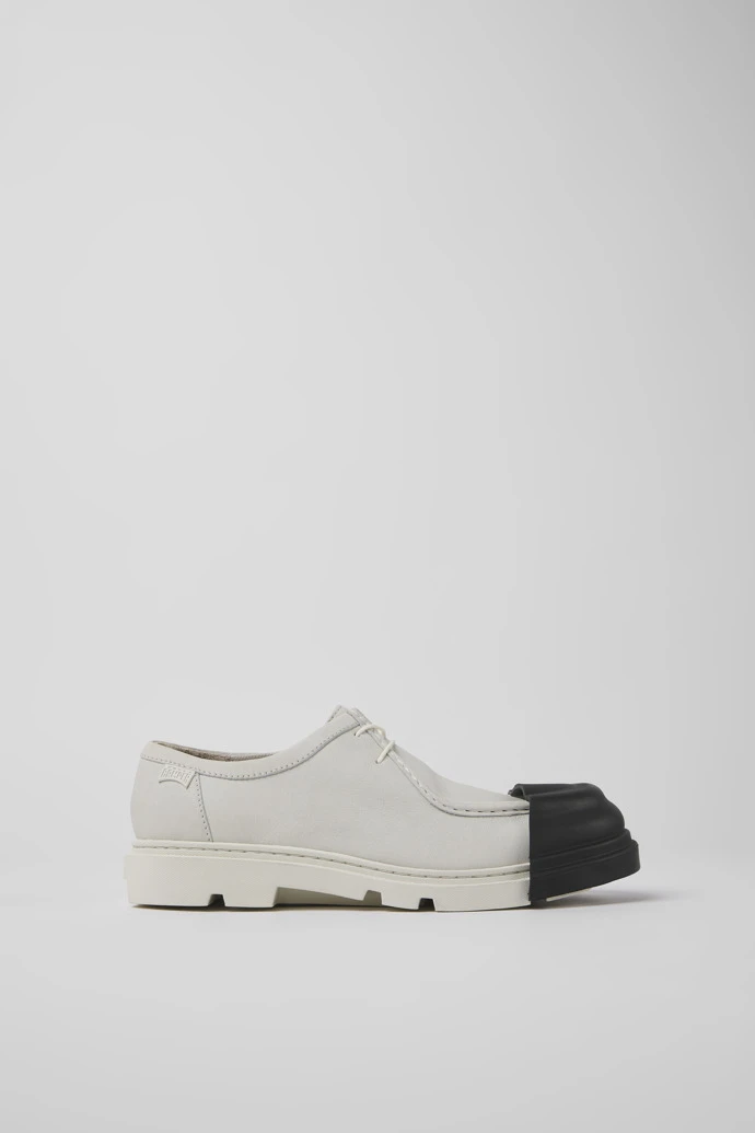 White non-dyed leather women’s shoes with removable toe caps, OrthoLite® Recycledâ„¢ removable footbeds, and rubber outsoles (40% natural, 23% recycled).