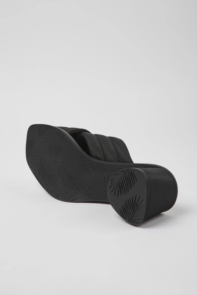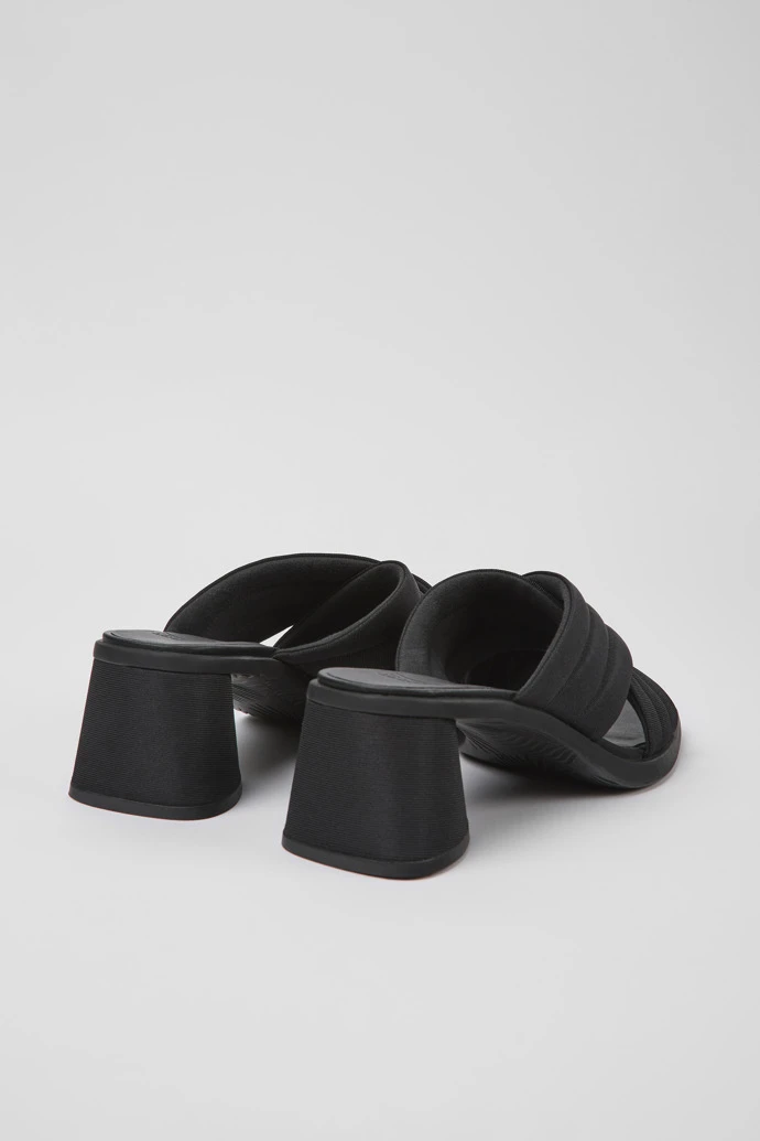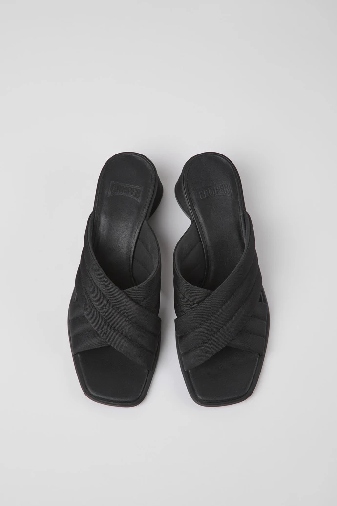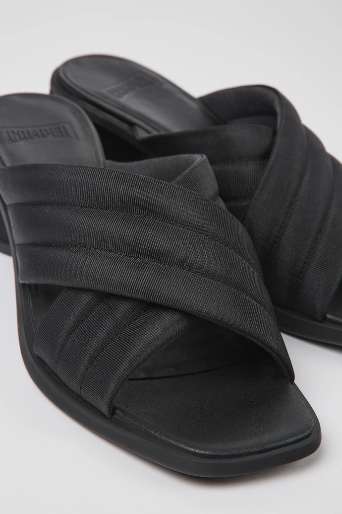 Black textile women’s sandals with OrthoLite® Recycled™ non-removable footbeds and rubber outsoles.