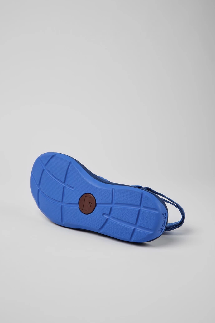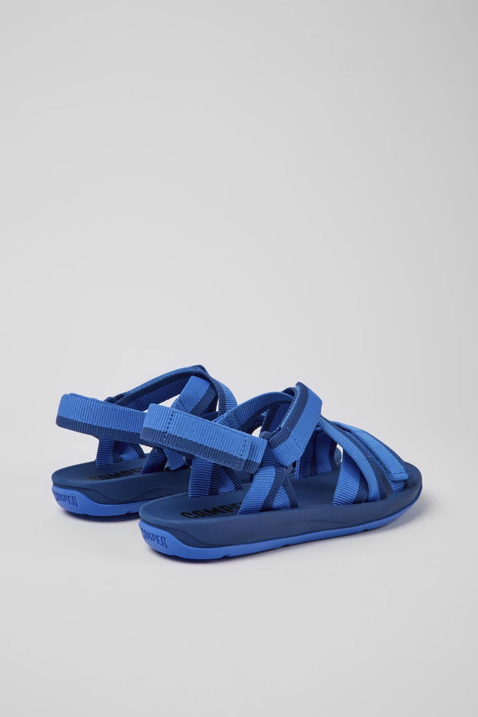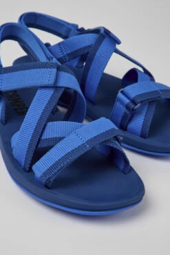 Blue men’s sandals with 100% recycled PET straps, EVA outsoles, and a hook-and-loop closing system.