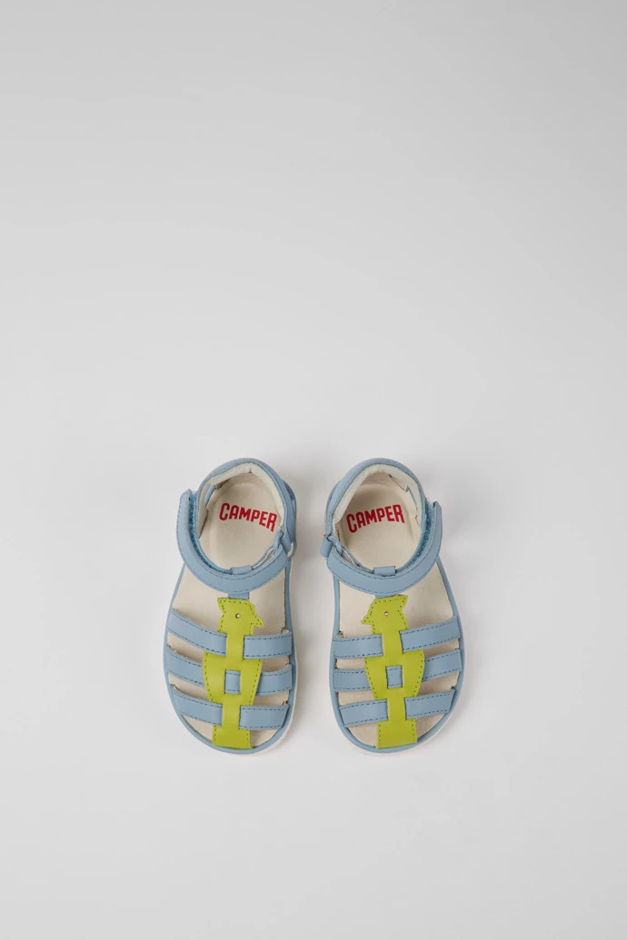 Blue and green leather kids’ sandals with parrot detail, a hook-and-loop closing system, and rubber outsoles.