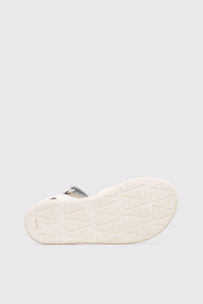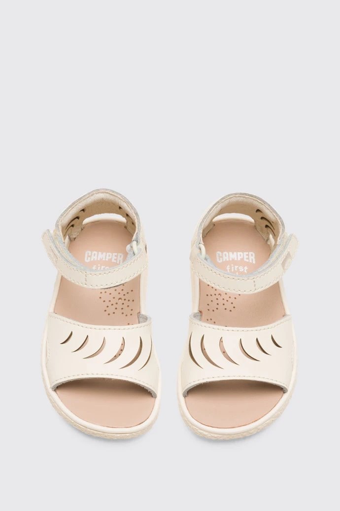 Cream girl’s full-grain leather sandal with rubber outsole.