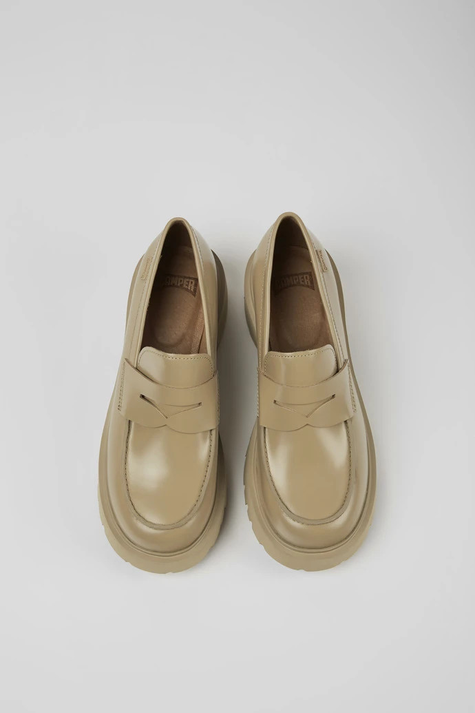 Beige leather women’s loafers with OrthoLite® Recycledâ„¢ non-removable footbeds and EVA outsoles.