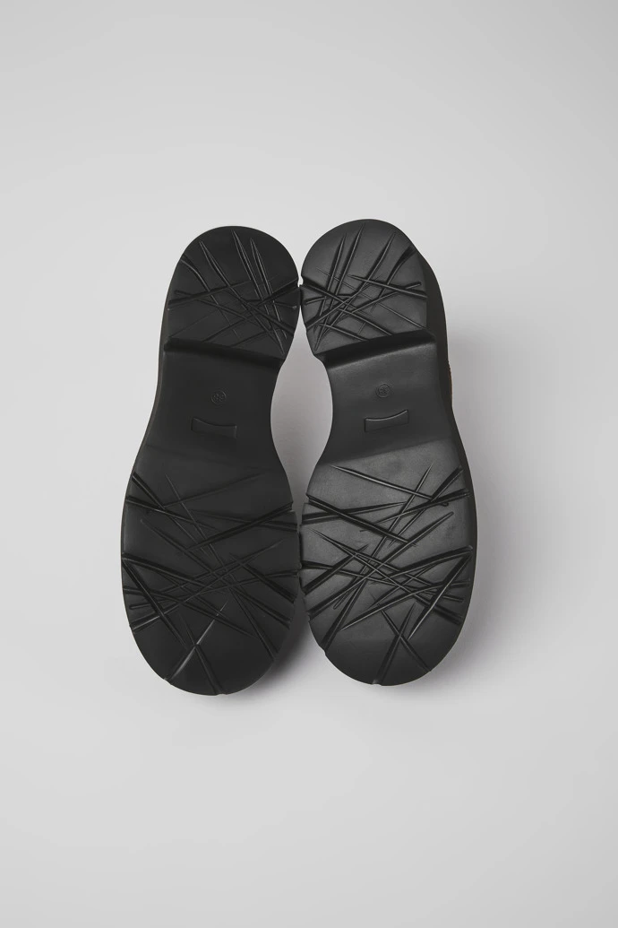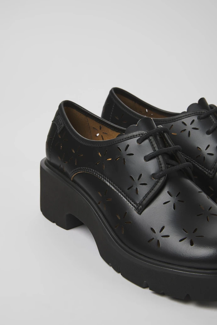 Black leather women’s shoes with cut-out flower motif, OrthoLite® Recycled™ non-removable footbeds, and EVA outsoles.