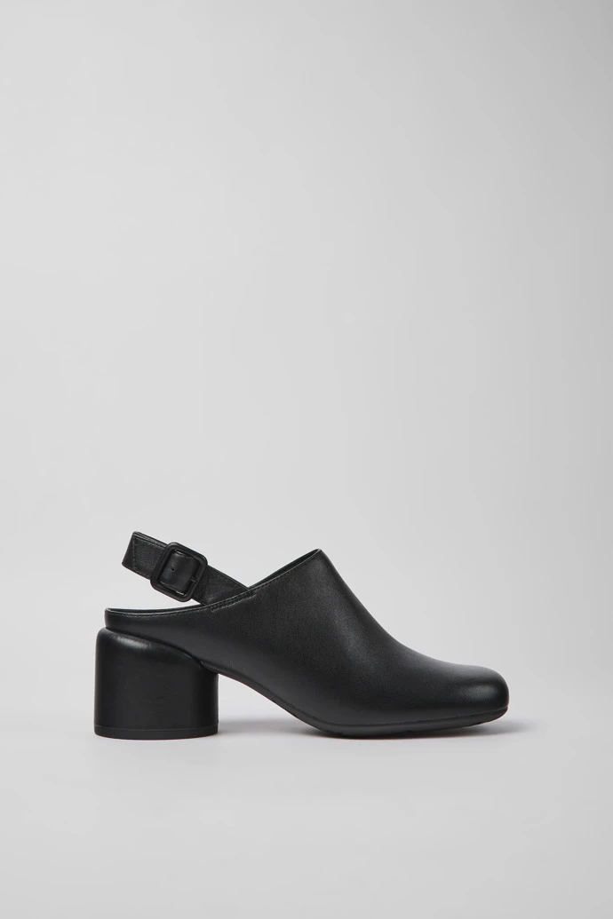 Black leather women’s heels with adjustable slingback straps, OrthoLite® Recycled™ non-removable footbeds, plus ABS and TPU outsoles.