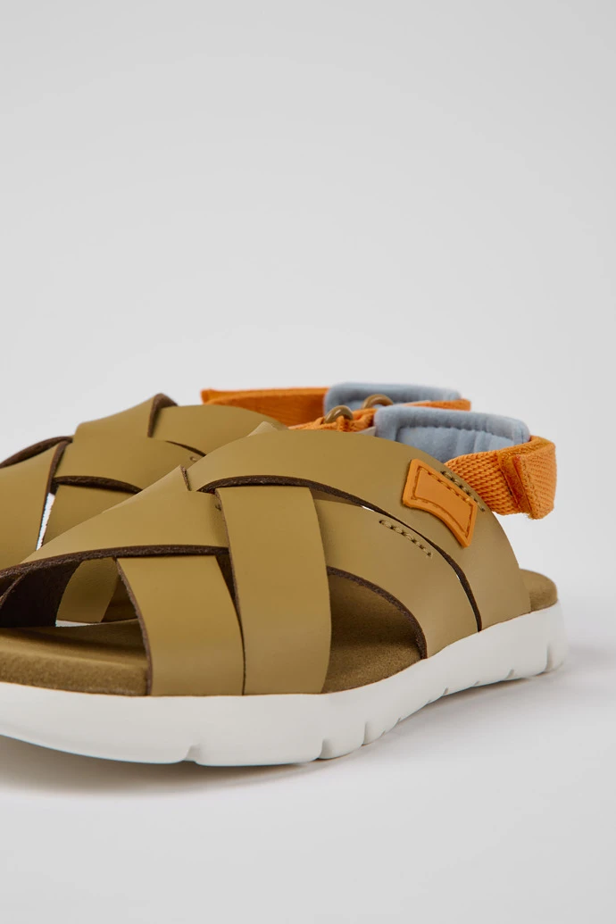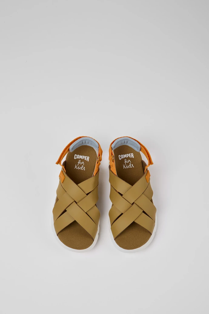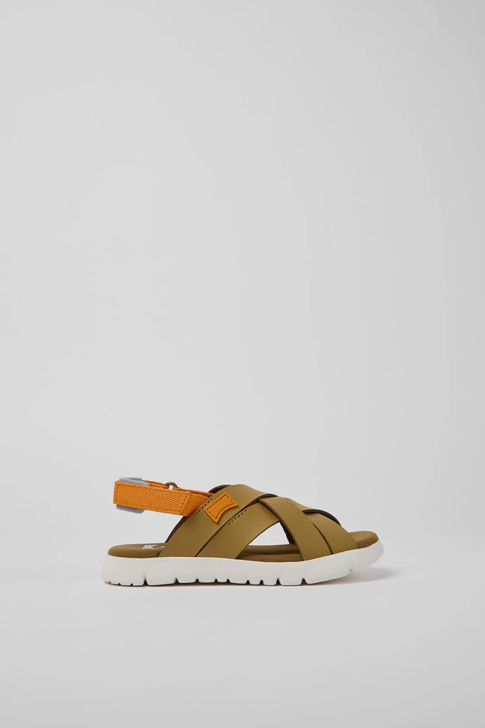 Brown and orange leather kids’ sandals with recycled PET heel strap, hook-and-loop closing system, and 100% EVA outsoles.