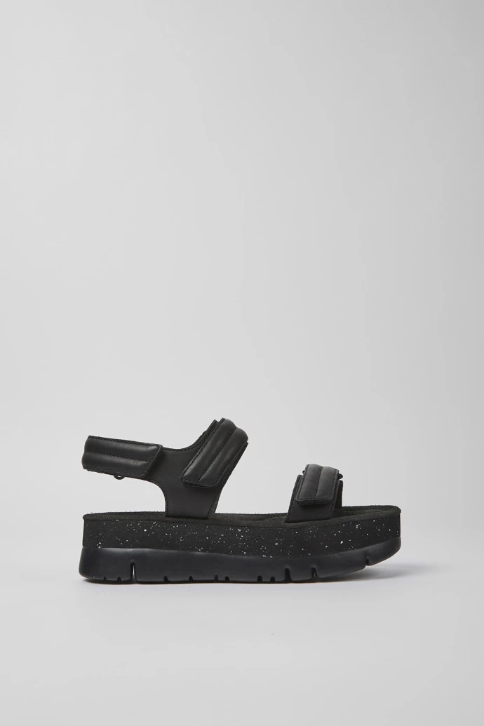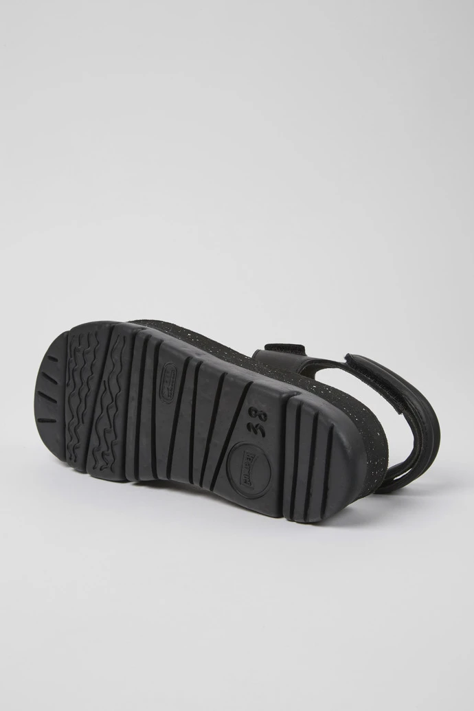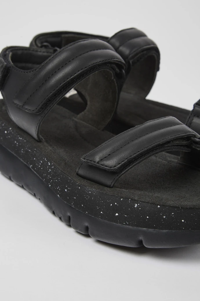 Black leather women’s sandals with a hook and loop closing system and XL EXTRALIGHT® EVA outsoles (51% recycled).