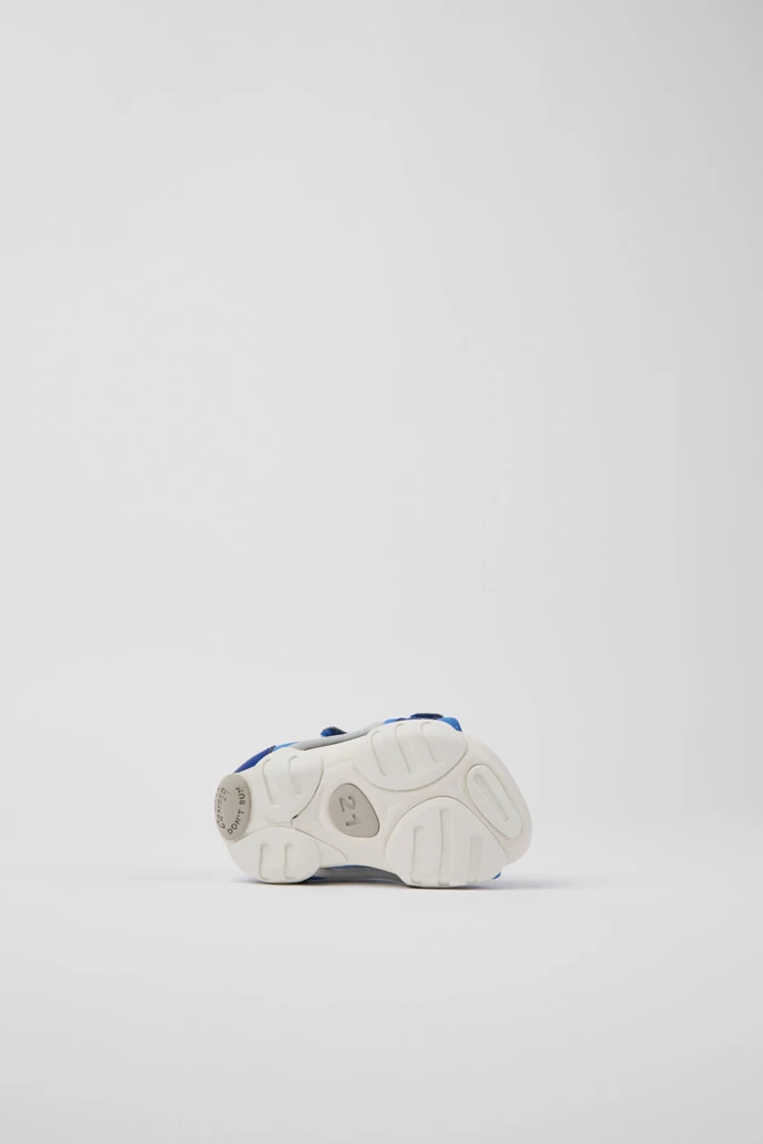 Blue kids’ sandals made with 55% coffee yarn fabric, with hook-and-loop closing system, and EVA and rubber outsoles.
