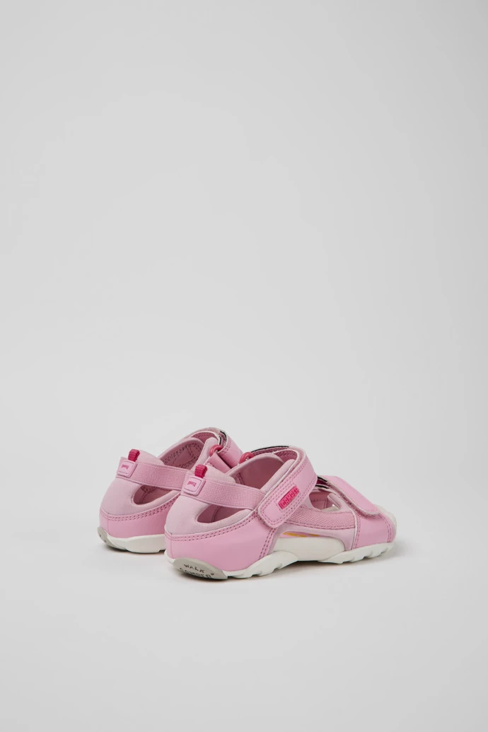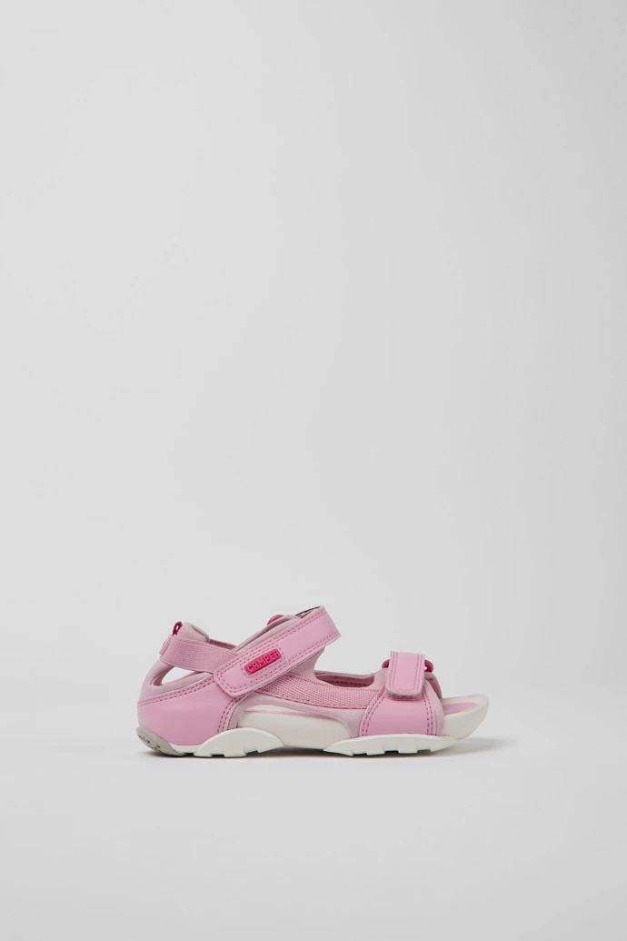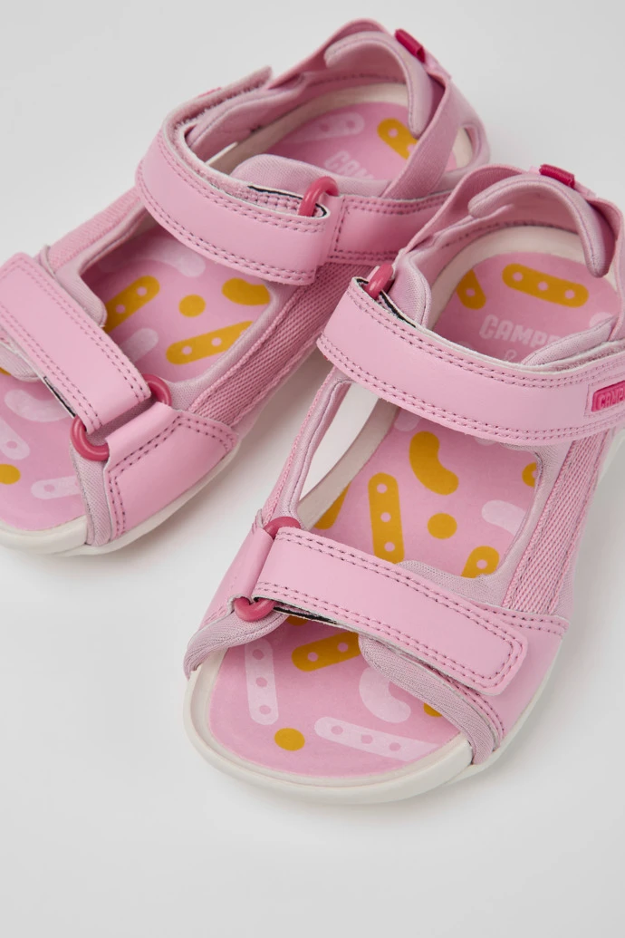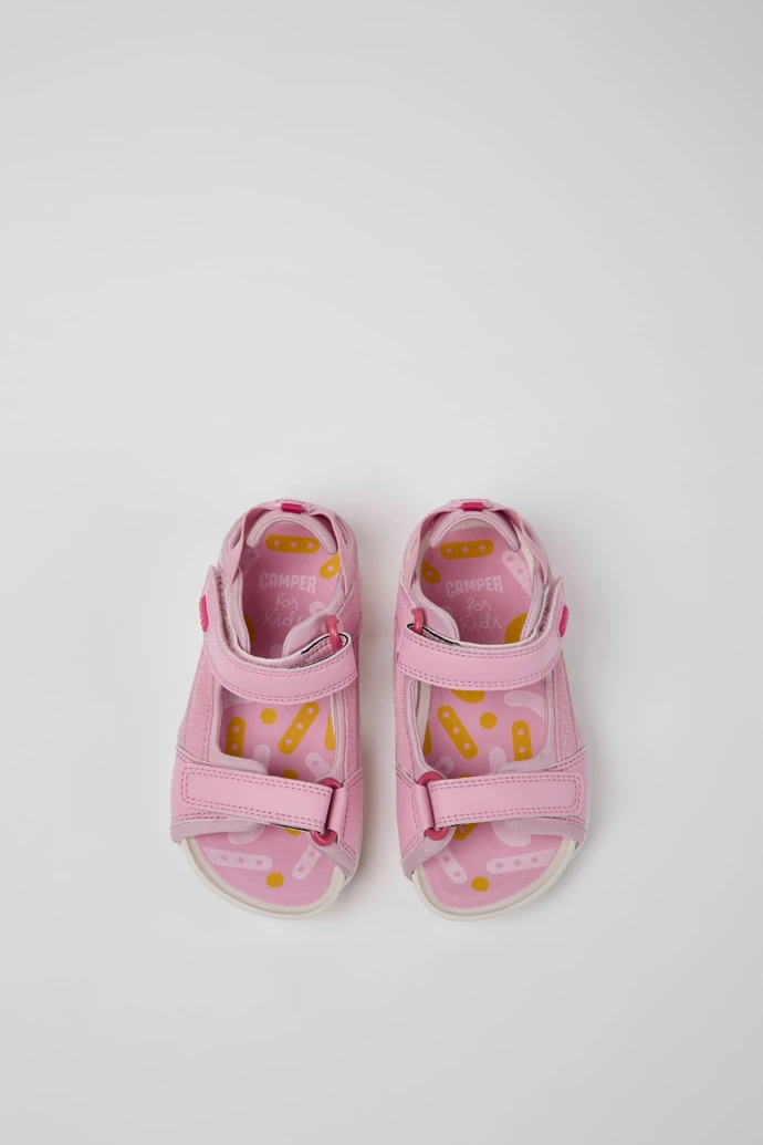 Pink leather and coffee yarn kids’ sandals with hook-and-loop closing system, and EVA and rubber outsoles.