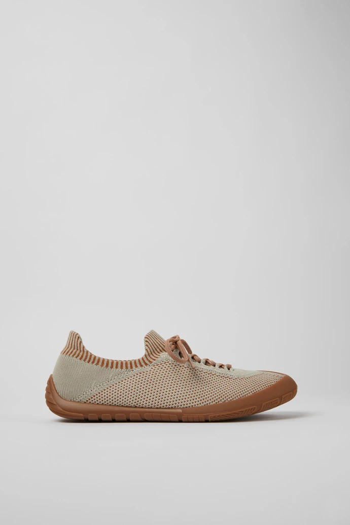 Gray and brown recycled PET one-piece knit men’s sneakers with OrthoLite® Recycled™ removable footbeds and rubber outsoles (40% natural, 23% recycled).