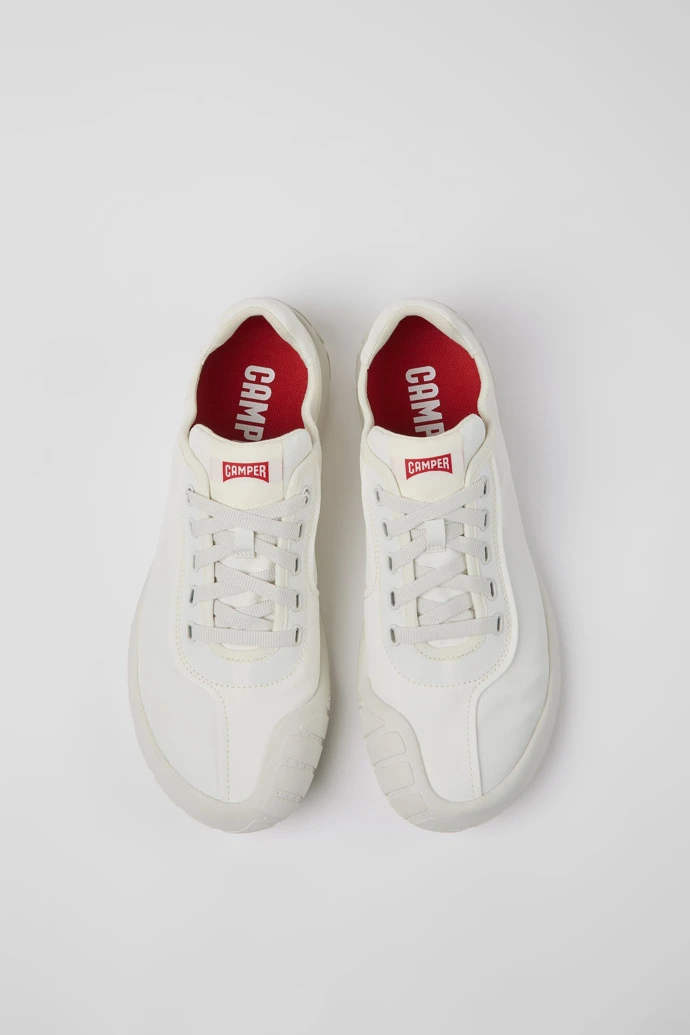 White recycled PET men’s sneakers with OrthoLite® Recycled™ removable footbeds and rubber outsoles (40% natural, 23% recycled).