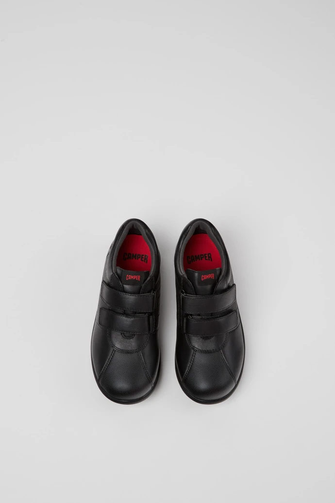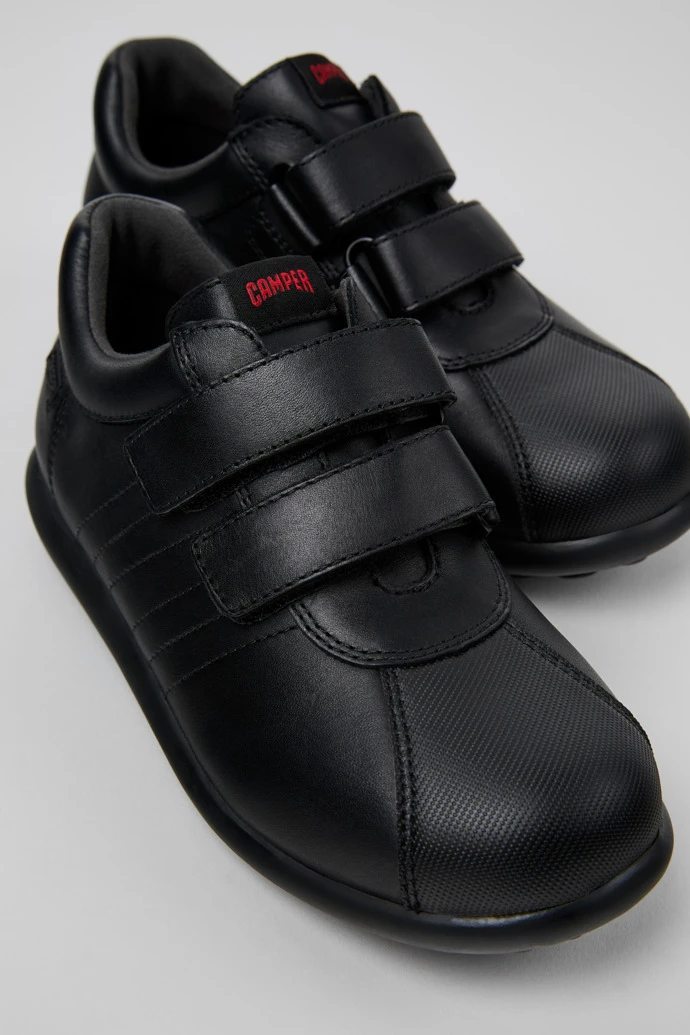 Black leather and textile kids’ shoes with hook-and-loop closing system and rubber outsoles.