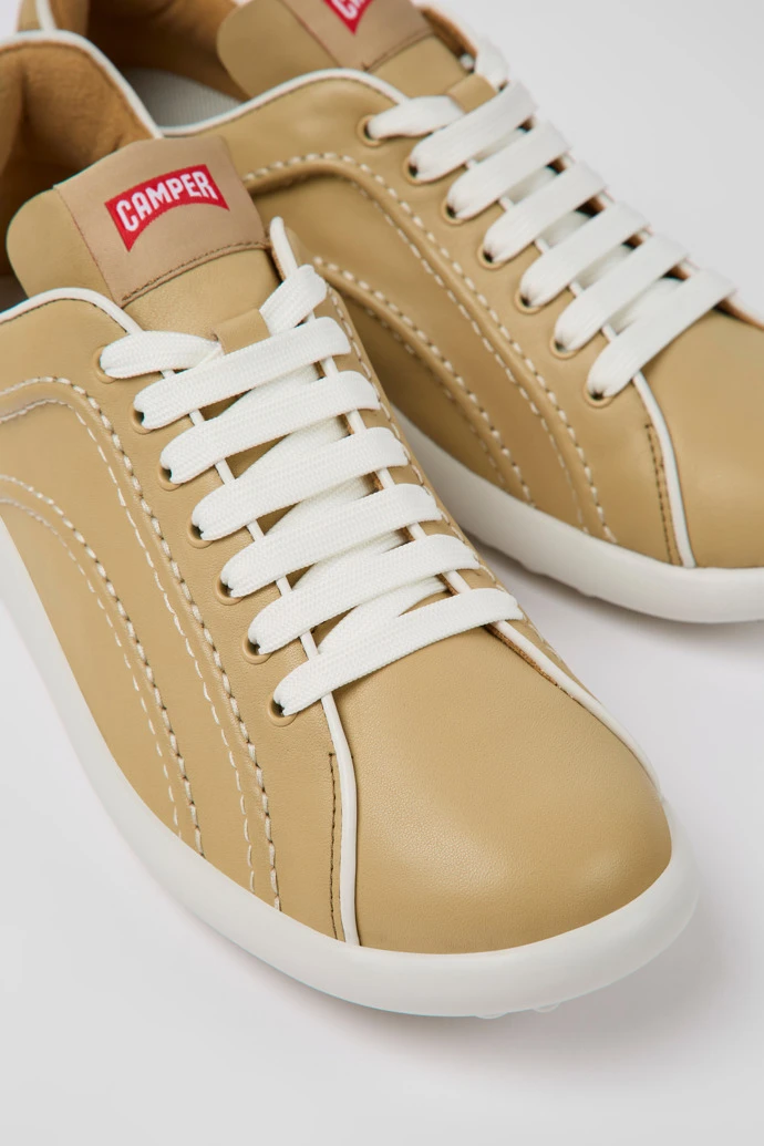 Beige leather women’s sneakers with removable PU footbeds and EVA outsoles.