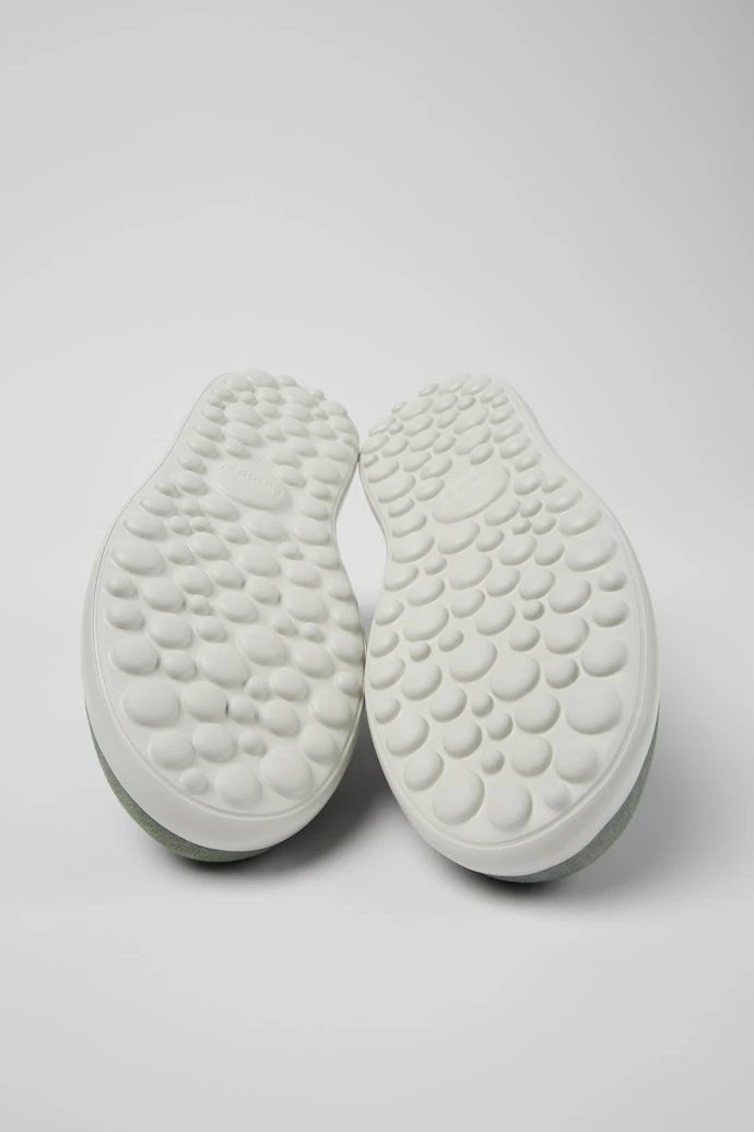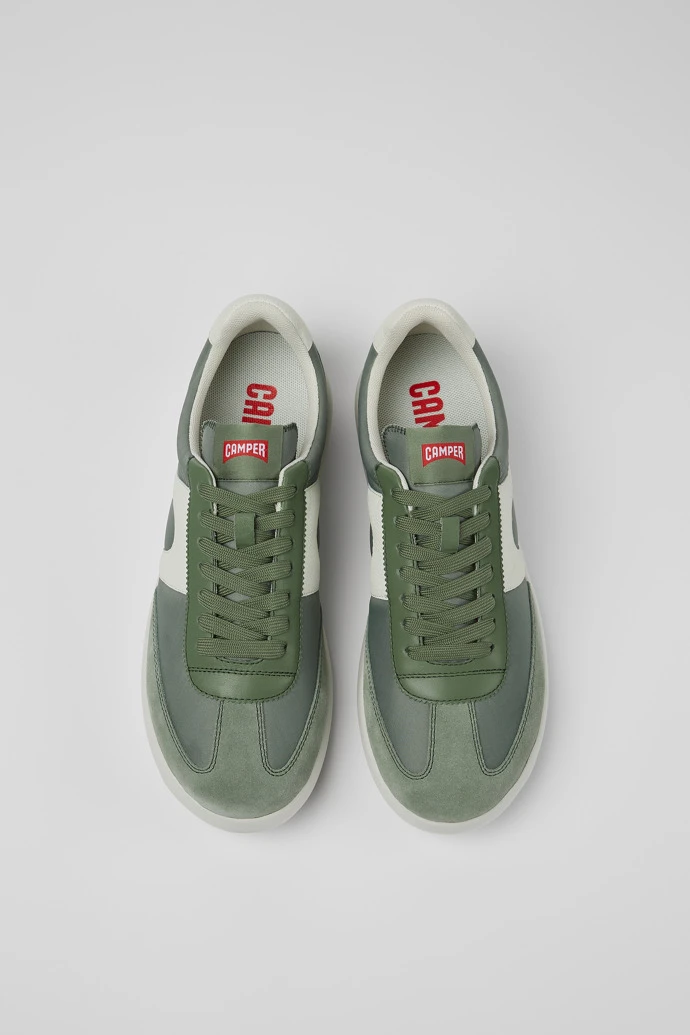 Green textile and leather men’s sneakers with removable PU footbeds and EVA outsoles.