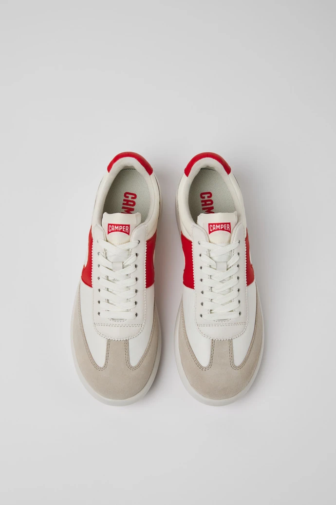 White and red textile and leather women’s sneakers with removable PU footbeds and EVA outsoles.