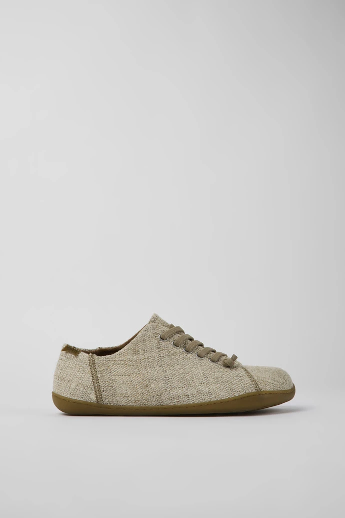 Beige men’s shoes with naturally-dyed regenerative hemp uppers, removable PU footbeds, and TPU outsoles (20% recycled).
