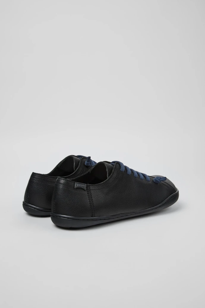 Black leather women’s shoes with removable PU footbeds and TPU outsoles (20% recycled).