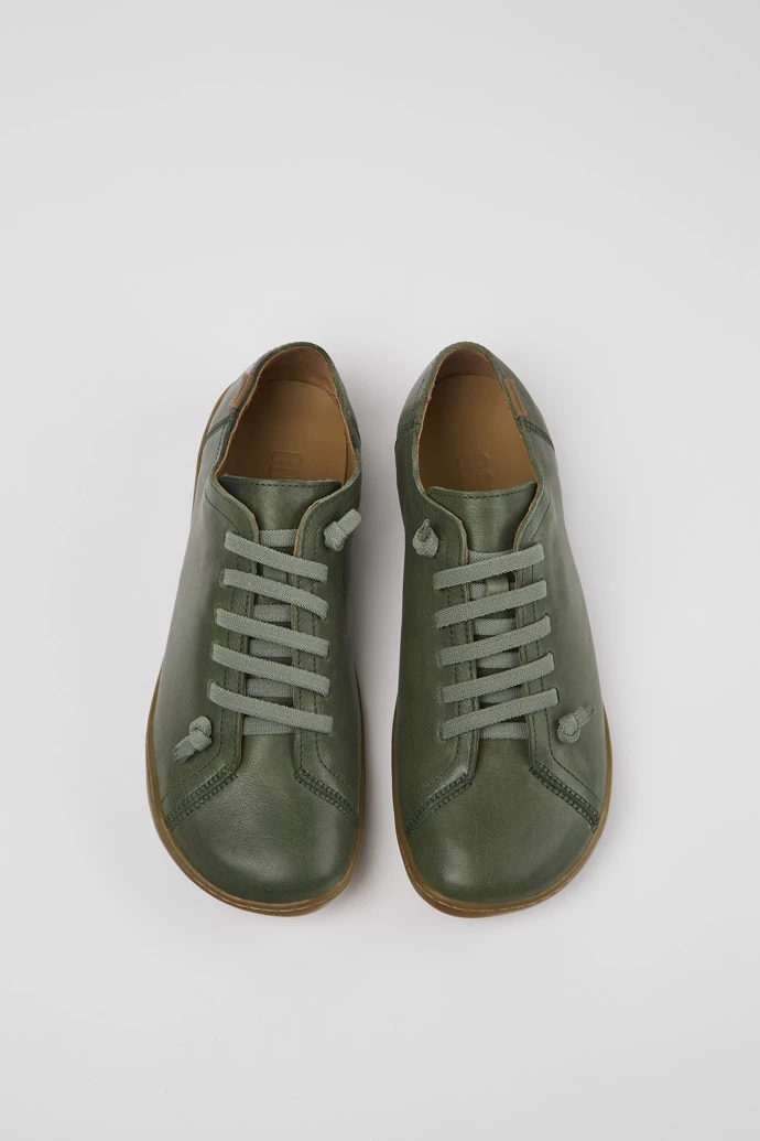 Green leather women’s shoes with removable PU footbeds and TPU outsoles (20% recycled).