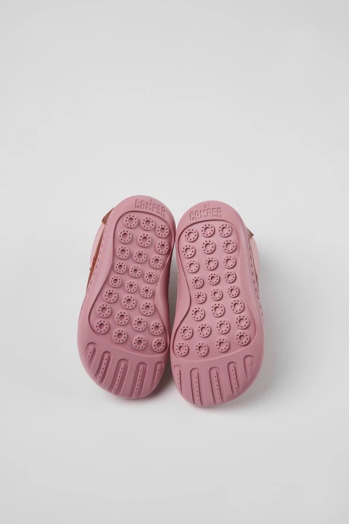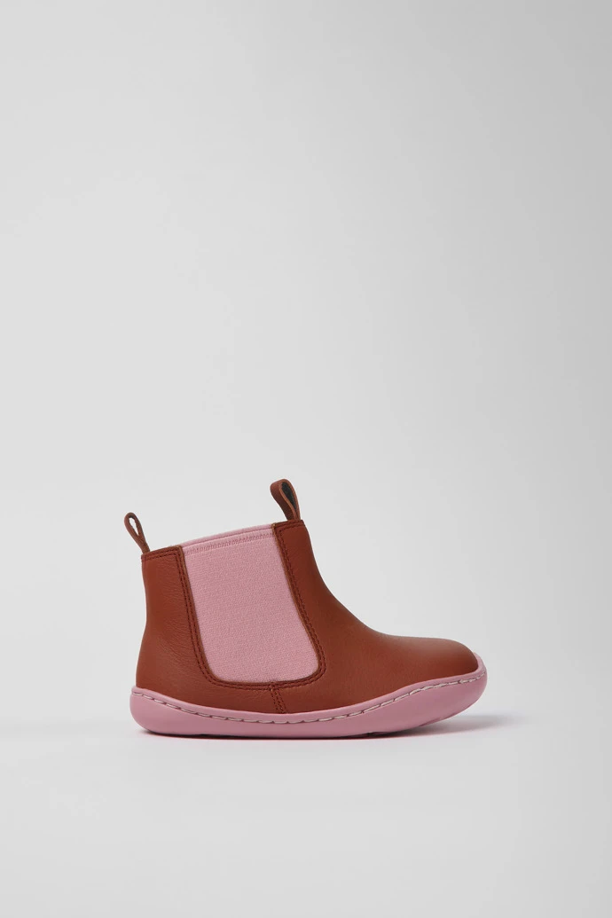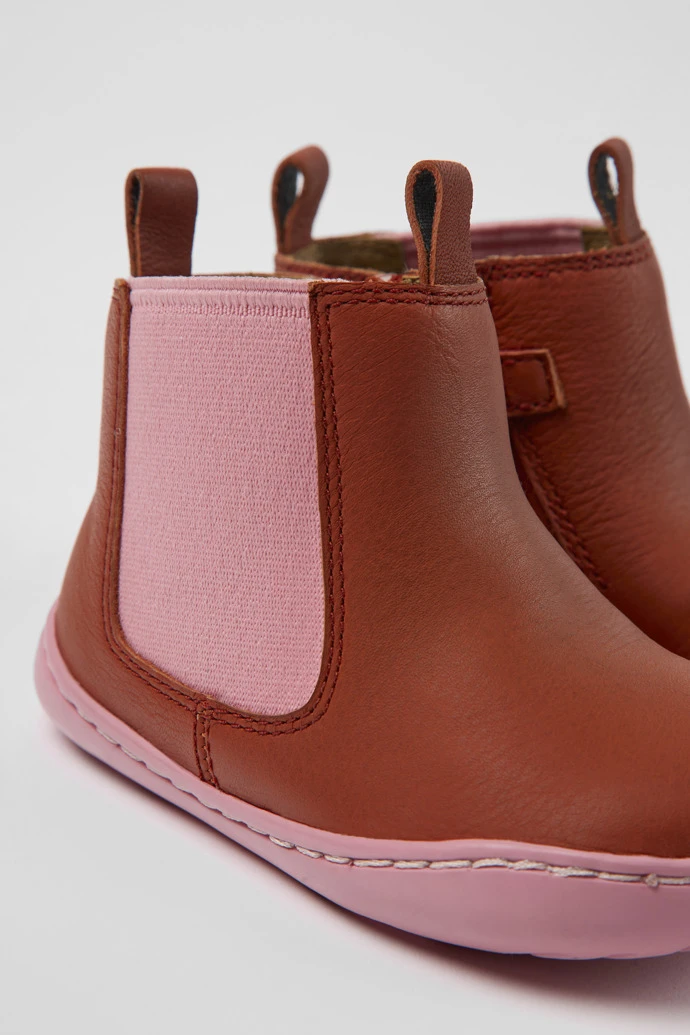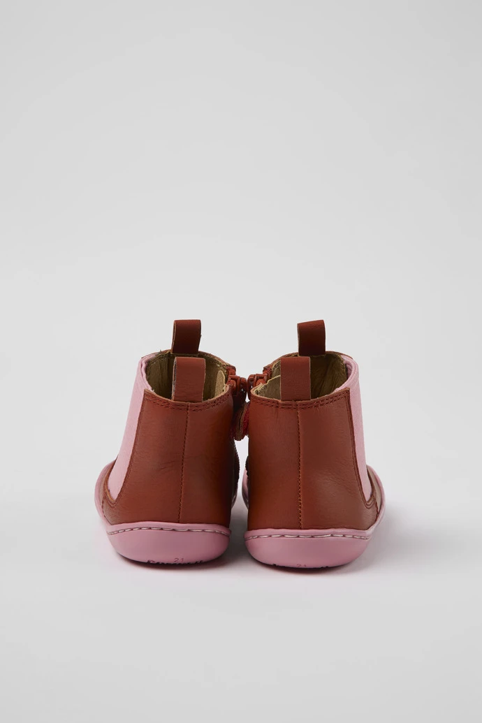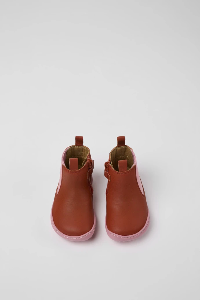 Red and pink leather kids’ boots with rubber outsoles (20% recycled).