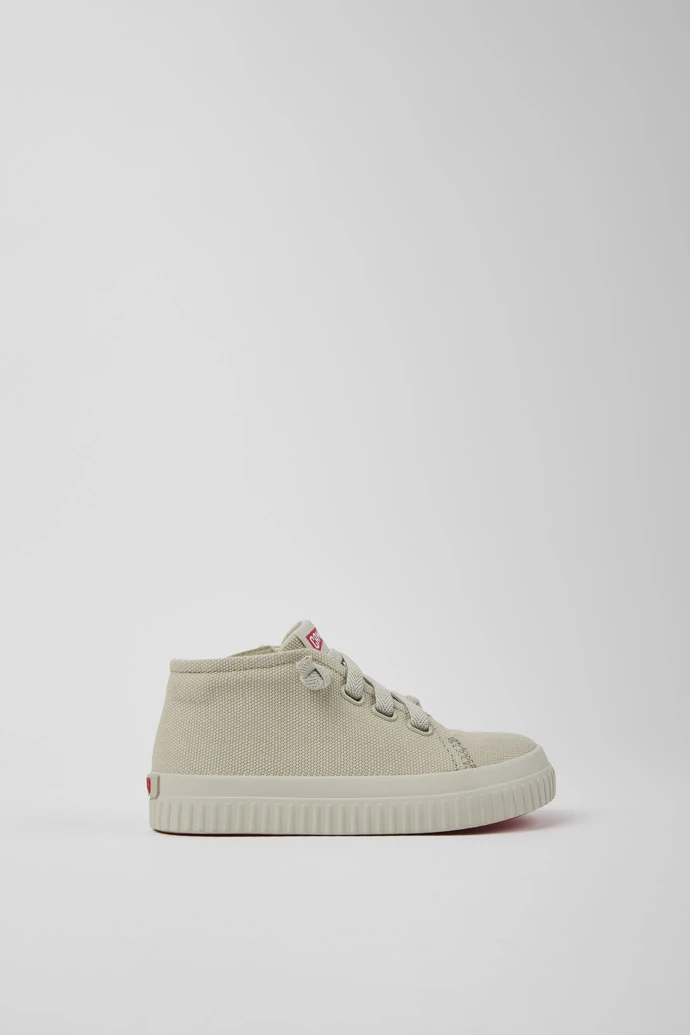 Gray textile kids’ sneakers with recycled cotton uppers, OrthoLite® Recycled™ removable footbeds, and rubber outsoles.