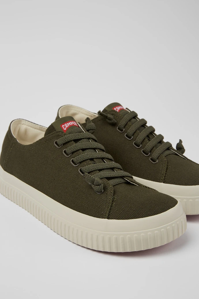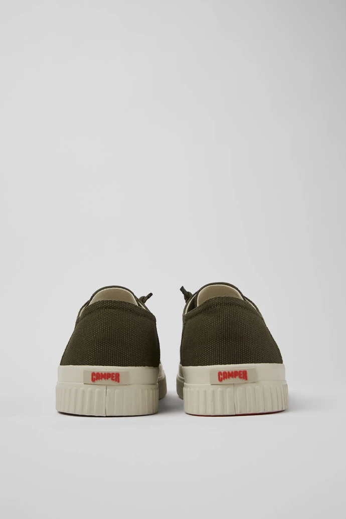 Green recycled cotton men’s sneakers with OrthoLite® Recycled™ footbeds and rubber outsoles.