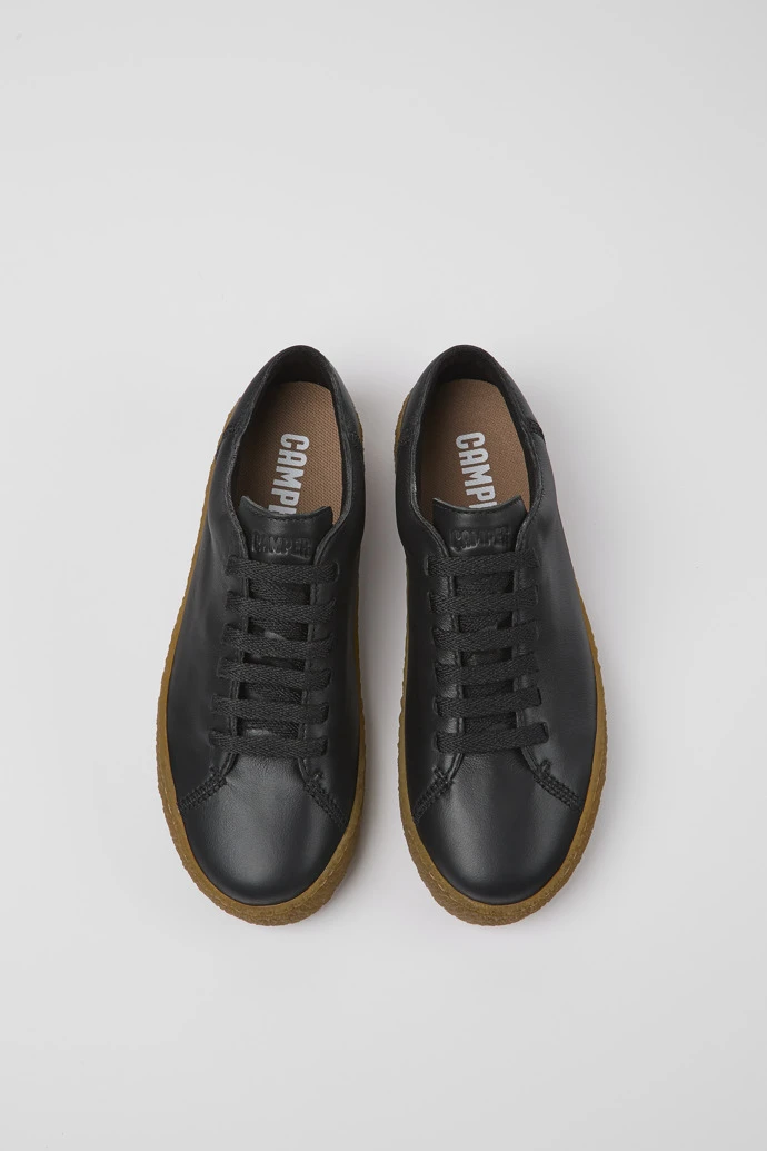Black leather women’s shoes with OrthoLite® Recycledâ„¢ non-removable footbeds and rubber outsoles.