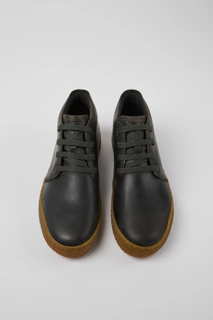 Gray leather men’s shoes, OrthoLite® Recycled™ non-removable footbeds, and rubber outsoles.