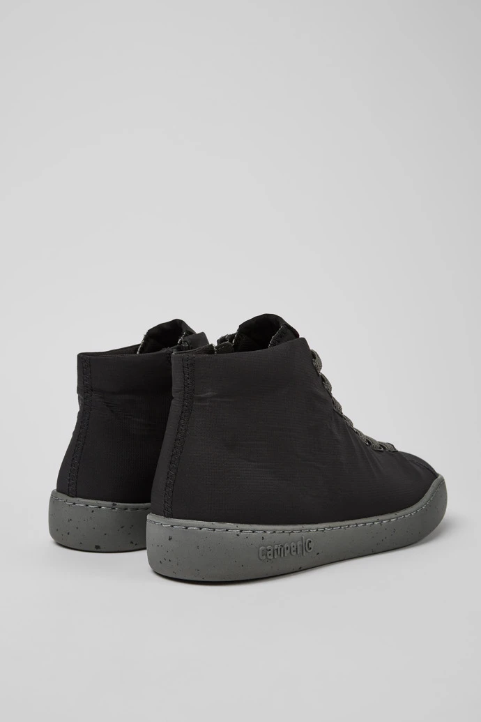 Black recycled PET men’s sneakers with elastic laces and EVA outsoles (20% recycled).